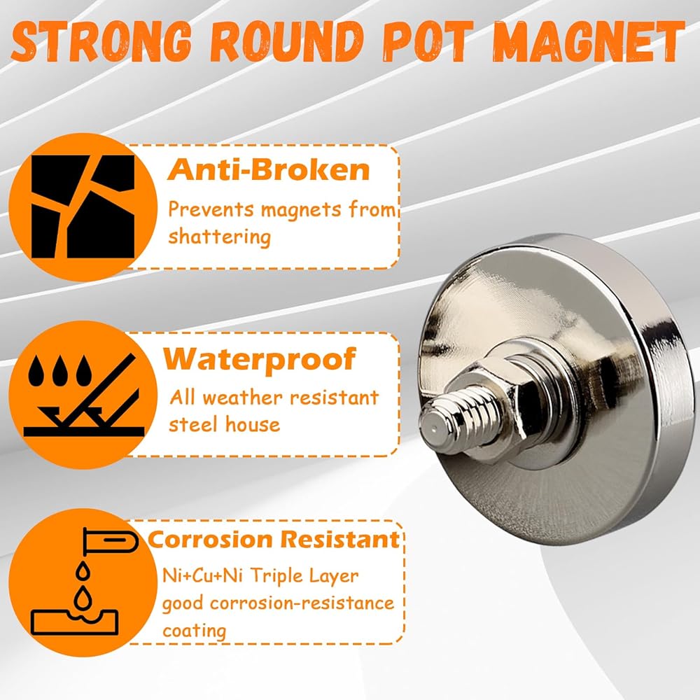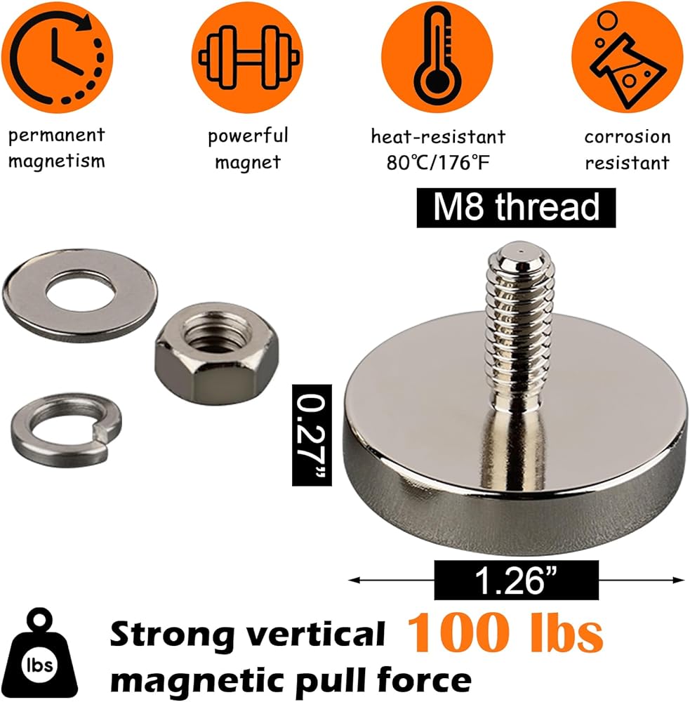 【مغناطيس دائري قوي من النيوديميوم】: تتضمن المجموعة 4 قطع من مغناطيس أكواب النيوديميوم القوي مع خيط ذكر M6، تأتي مع غسالات وصواميل. مغناطيس كأس النيوديميوم مطلي بثلاث طبقات من Ni+Cu+Ni، لذلك فهو يوفر حماية لامعة ومقاومة للتآكل للمغناطيسات القوية شديدة التحمل.