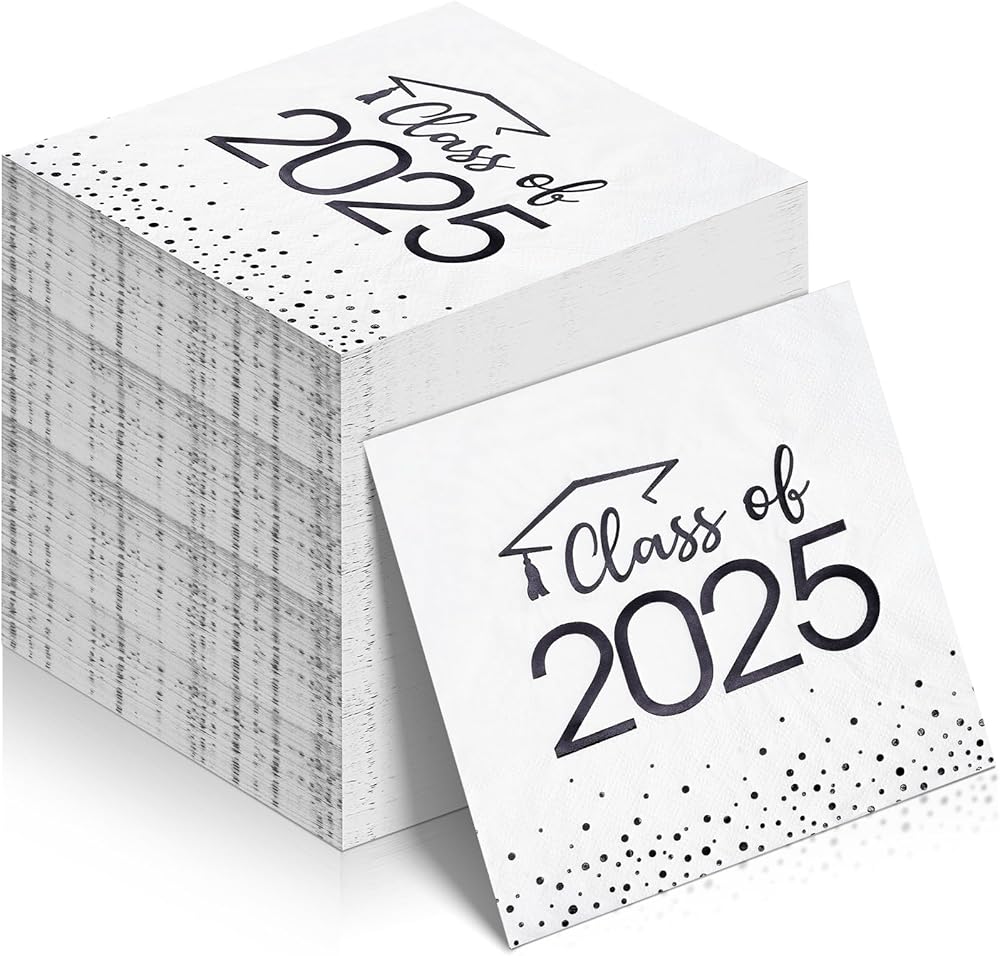 100pcs فئة 2025 مناديل التخرج ، تهانينا القابلة للتخلص من الورق الكوكتيل المناديل المناديل مربعة نقاط مناشف اليد لعام 2025 كلية التخرج الجامعية (أسود أبيض)