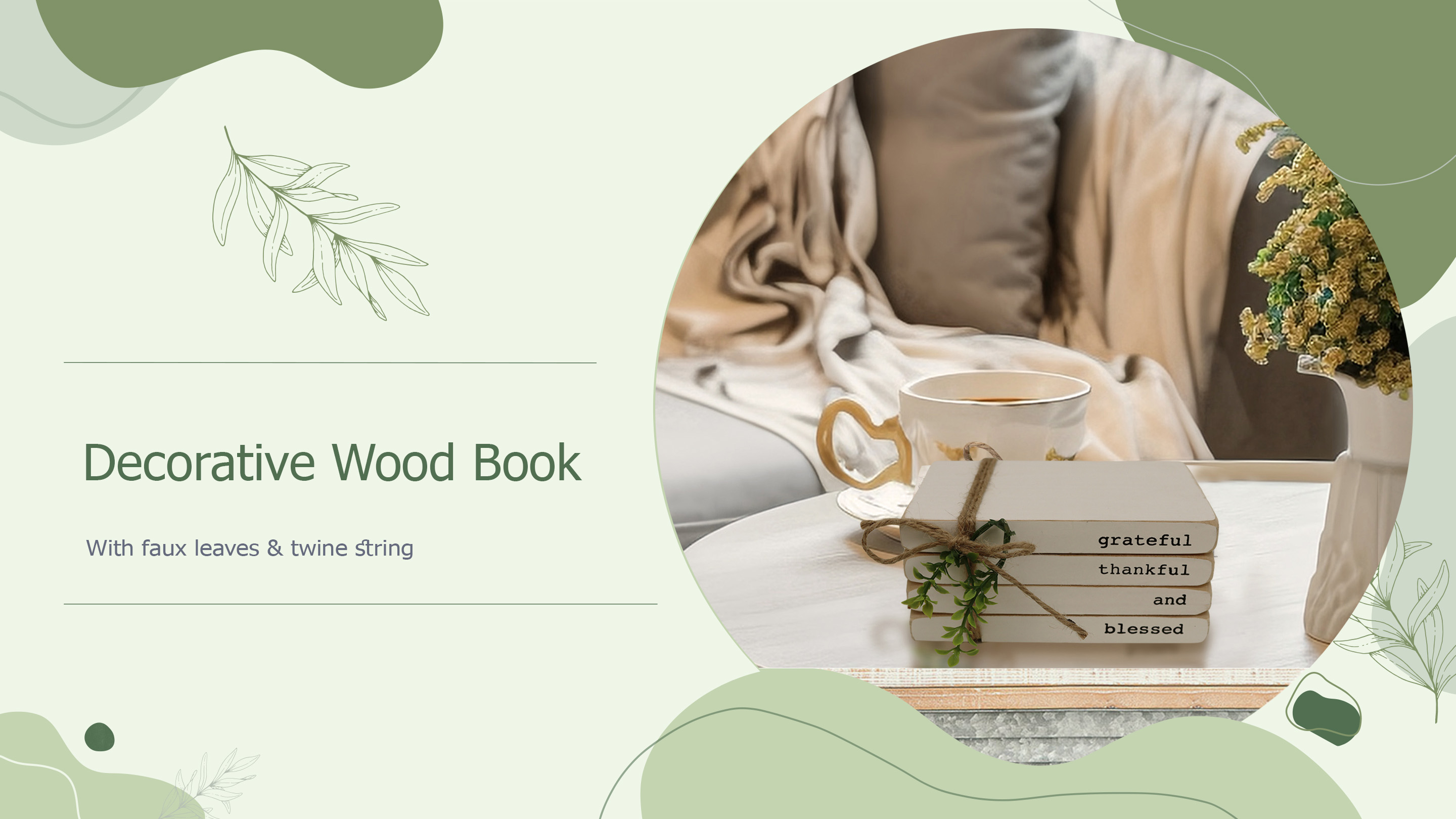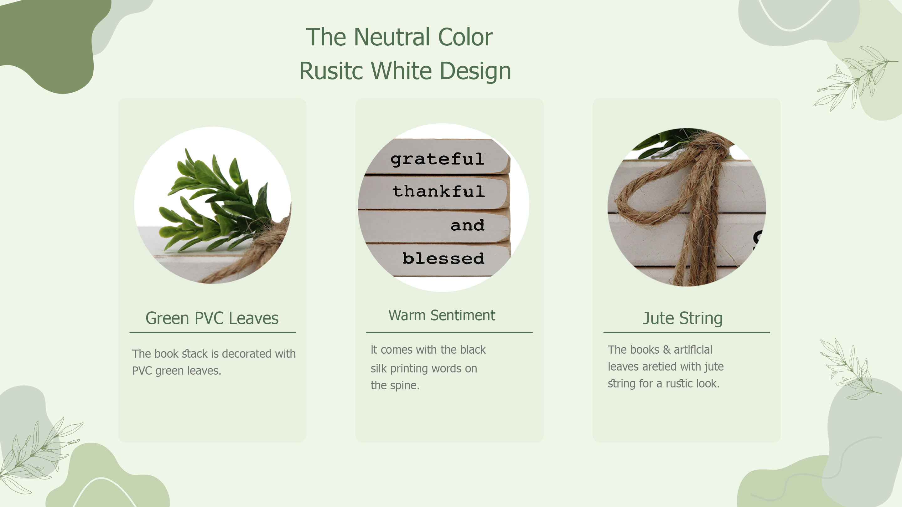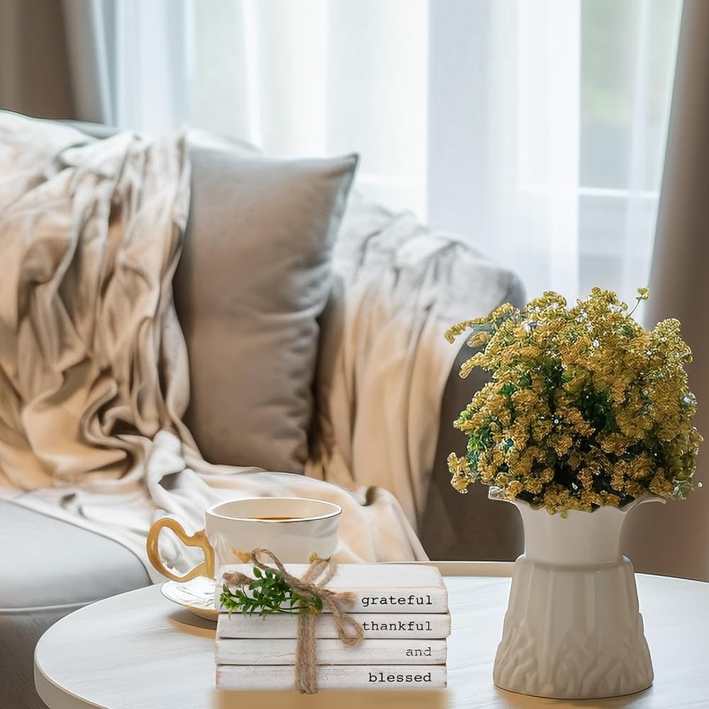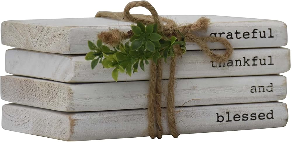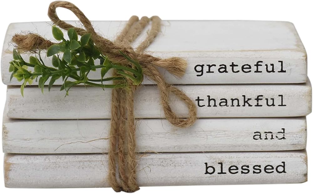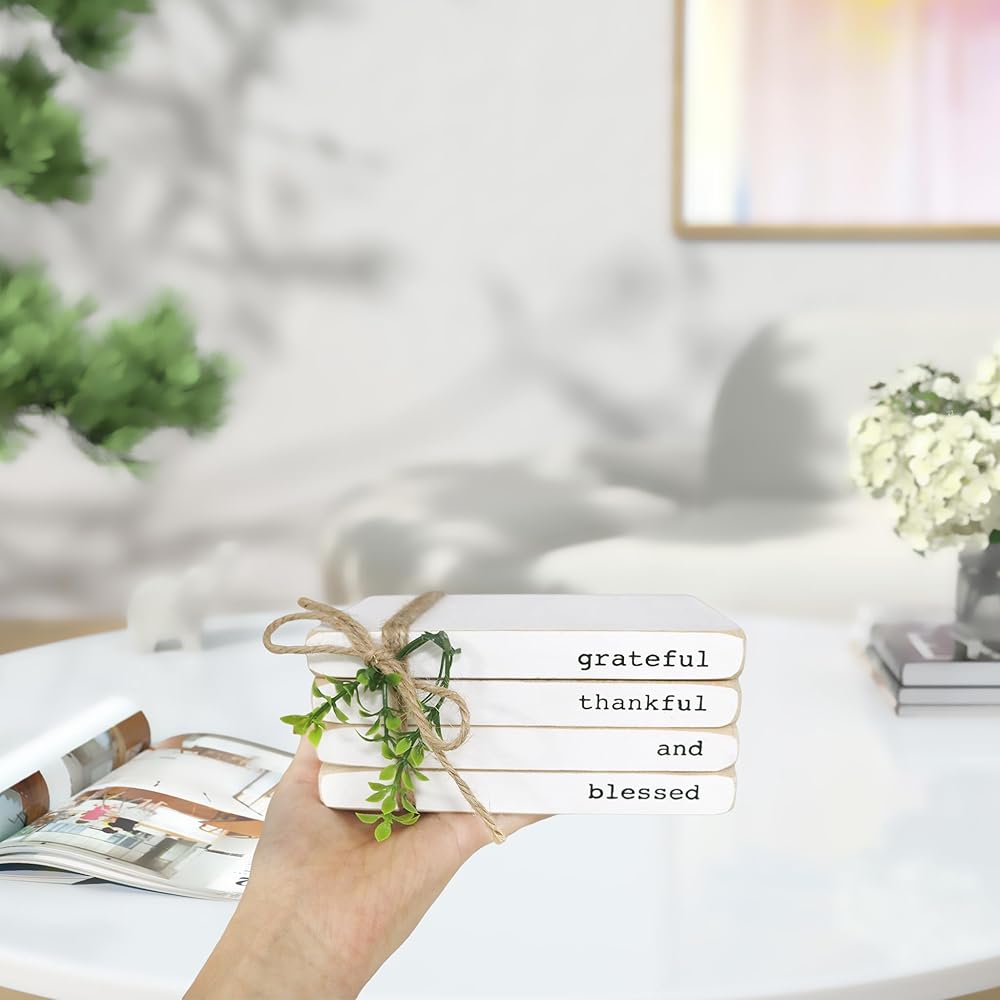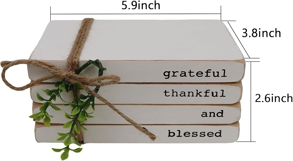 تصميم فريد - يبدو هذا الجسم الخشبي مثل 4 كتب مكدسة بلون أبيض، ملفوفة بخيط الجوت ومزينة بأوراق PVC الخضراء. توضح الأشواك العبارة الدافئة بنص أسود. تعتبر مجموعة الكتب المستوحاة من بيت المزرعة مثالية لإضافة شعور مريح وإضفاء سحر ريفي على منزلك. رائعة كهدية بمناسبة الانتقال إلى منزل جديد أو عيد الشكر.