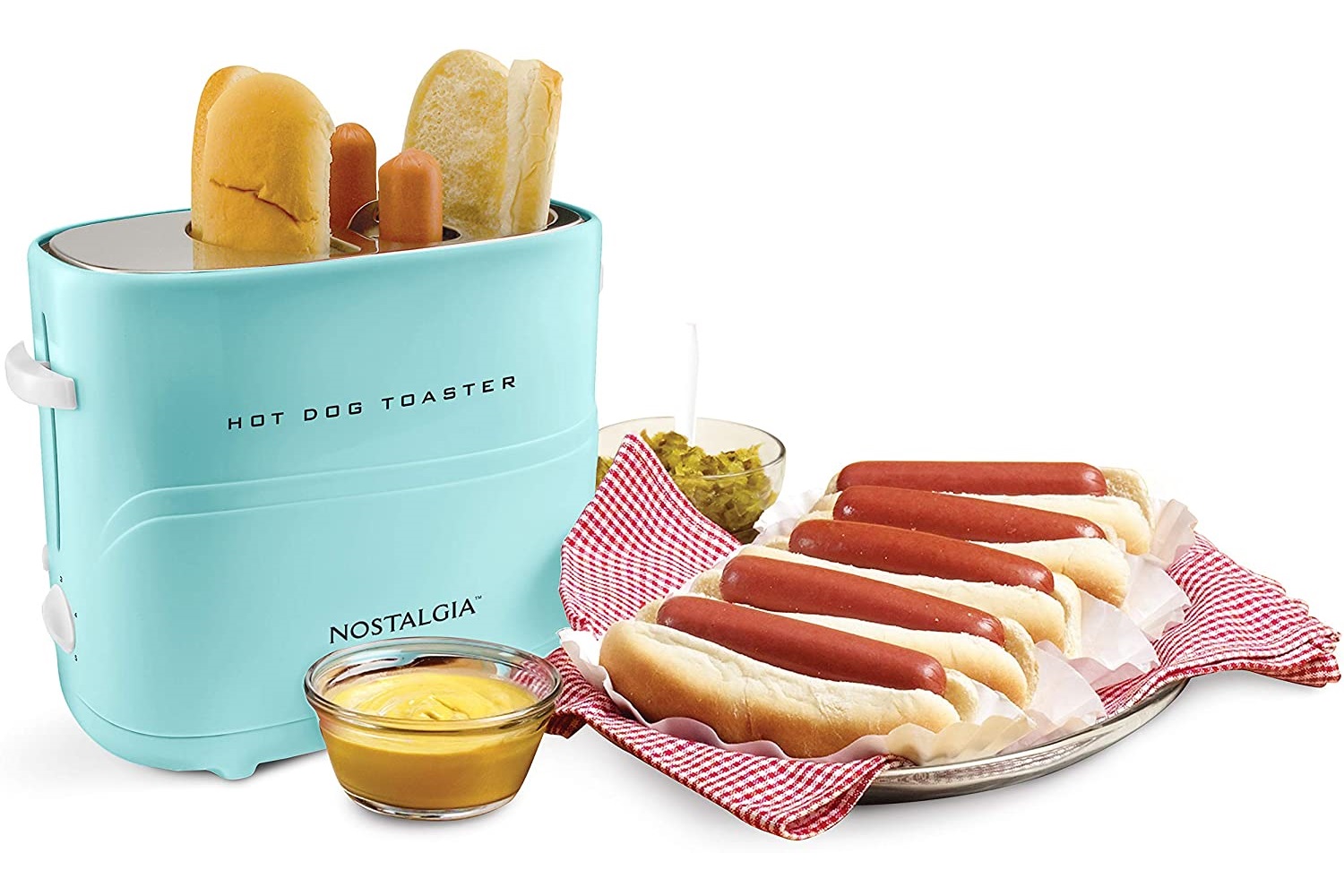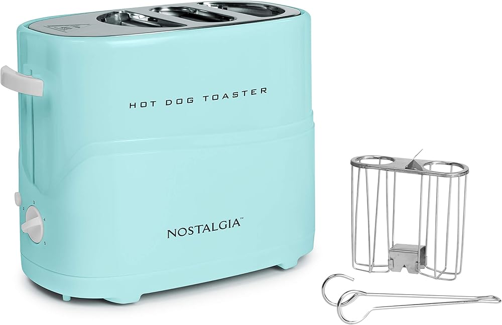 The Nostalgia Retro Classic 2 Slot Hot Dog and Bun Toaster with mini tongs is the perfect additions to your kitchen appliance collection. The Nostalgia Hot Dog Toaster is great for entertaining and as a fast meal solution for the whole family. This hot dog toaster can toast up to two of your favorite regular-size or extra-plump hot dogs and two hotdog buns at the same time. It has adjustable settings for toasting timer and stop toasting button that allow you to toast your hot dogs to your preferred doneness. The included mini tongs and hot dog cage keep hands safe when removing hot dogs from this appliance, while the drip tray slides out easily after use for easy cleaning. The cord wrap on the bottom side of this hot dog cooker also helps with tidy storage.