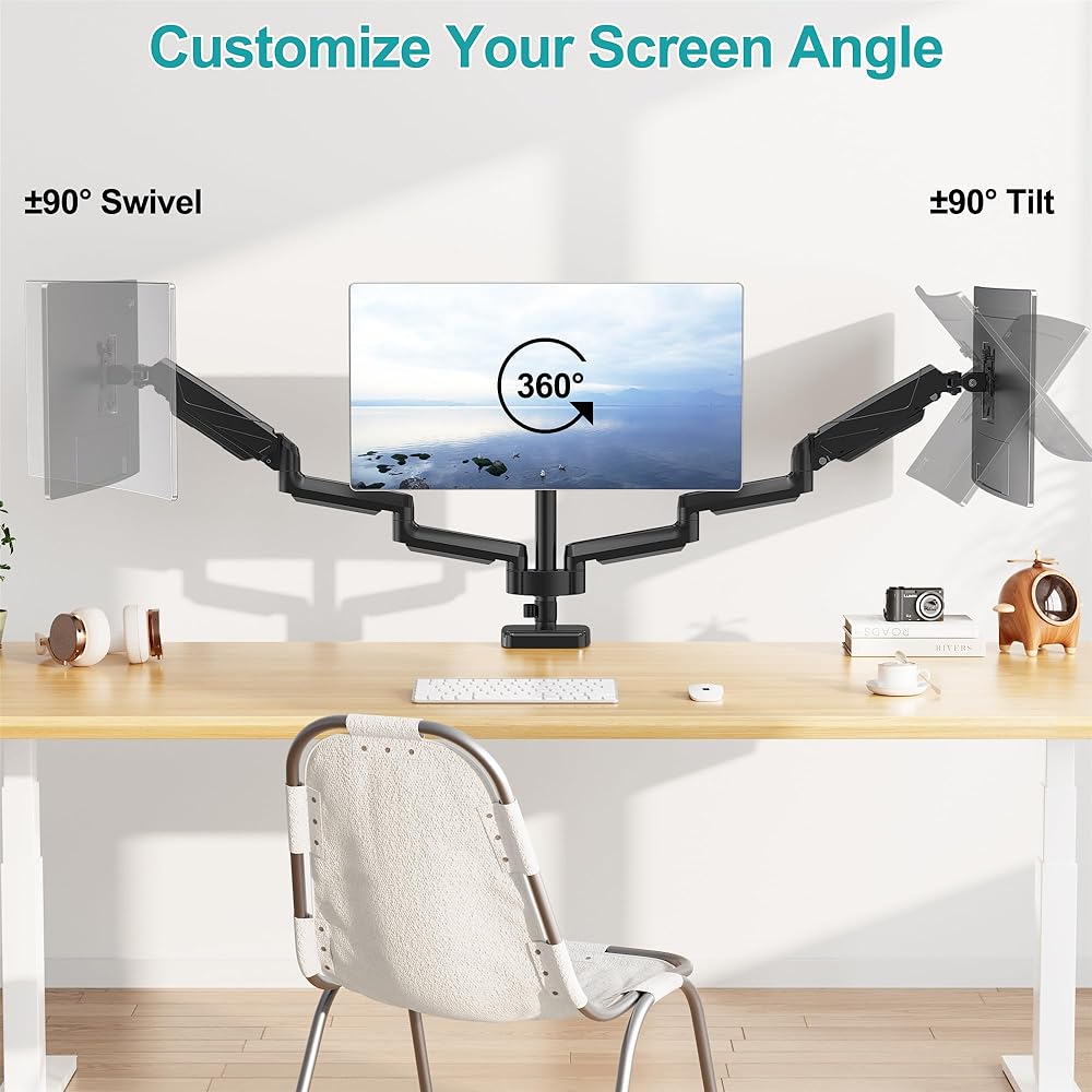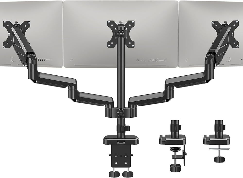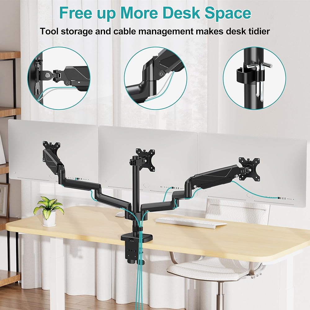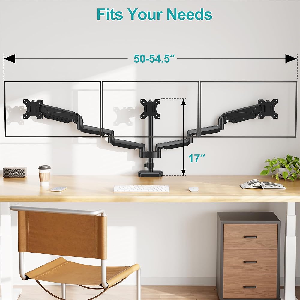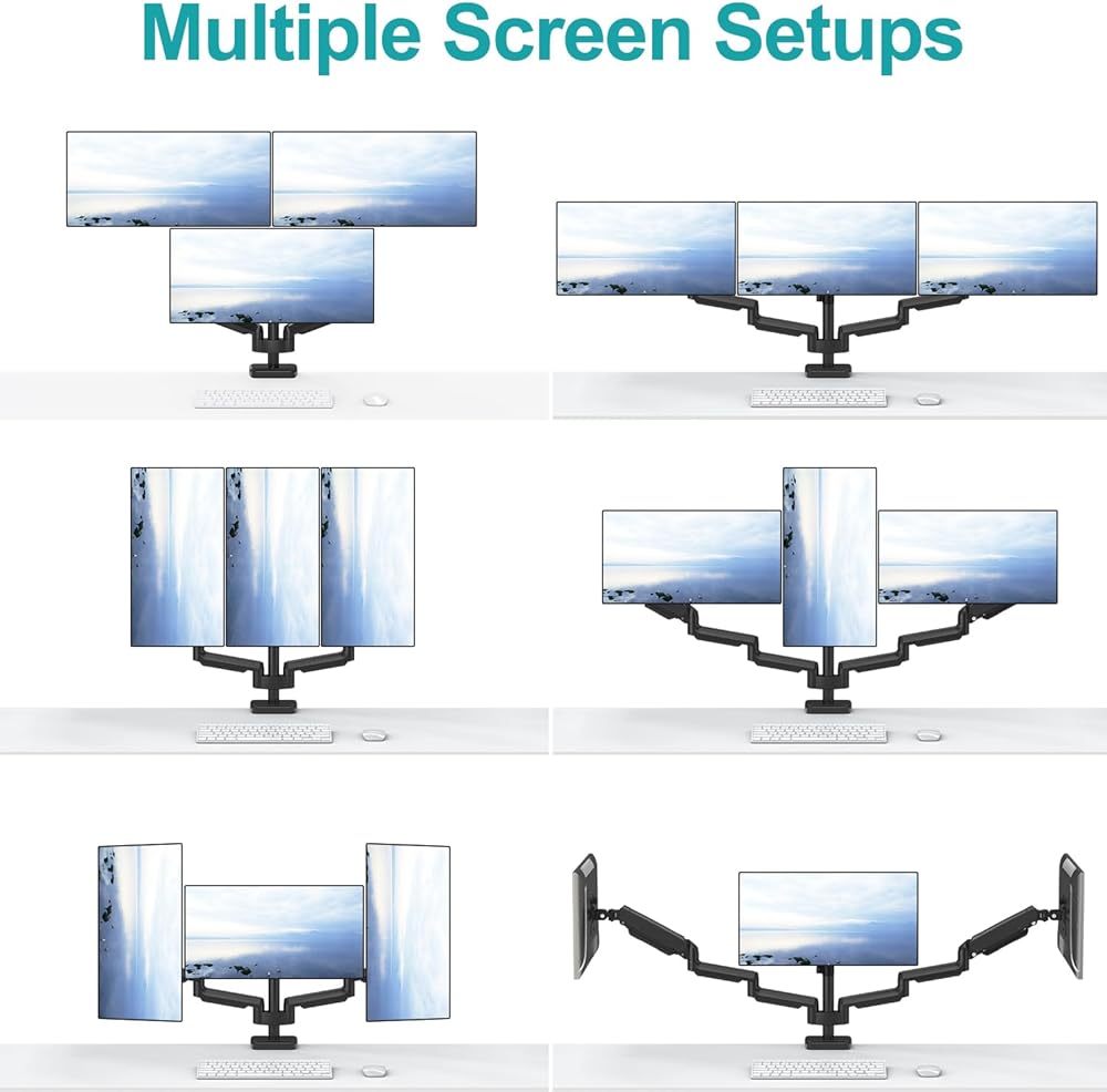 حامل شاشة ثلاثي، حامل شاشة مكتبي لـ 3 شاشات كمبيوتر حتى 32 بوصة، ذراع شاشة ثلاثي مع زنبرك غاز، حامل شاشة عالي التحمل يحمل ما يصل إلى 17.6 رطل لكل واحدة، حامل Vesa 75x75، 100x100