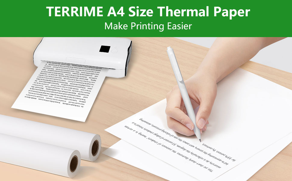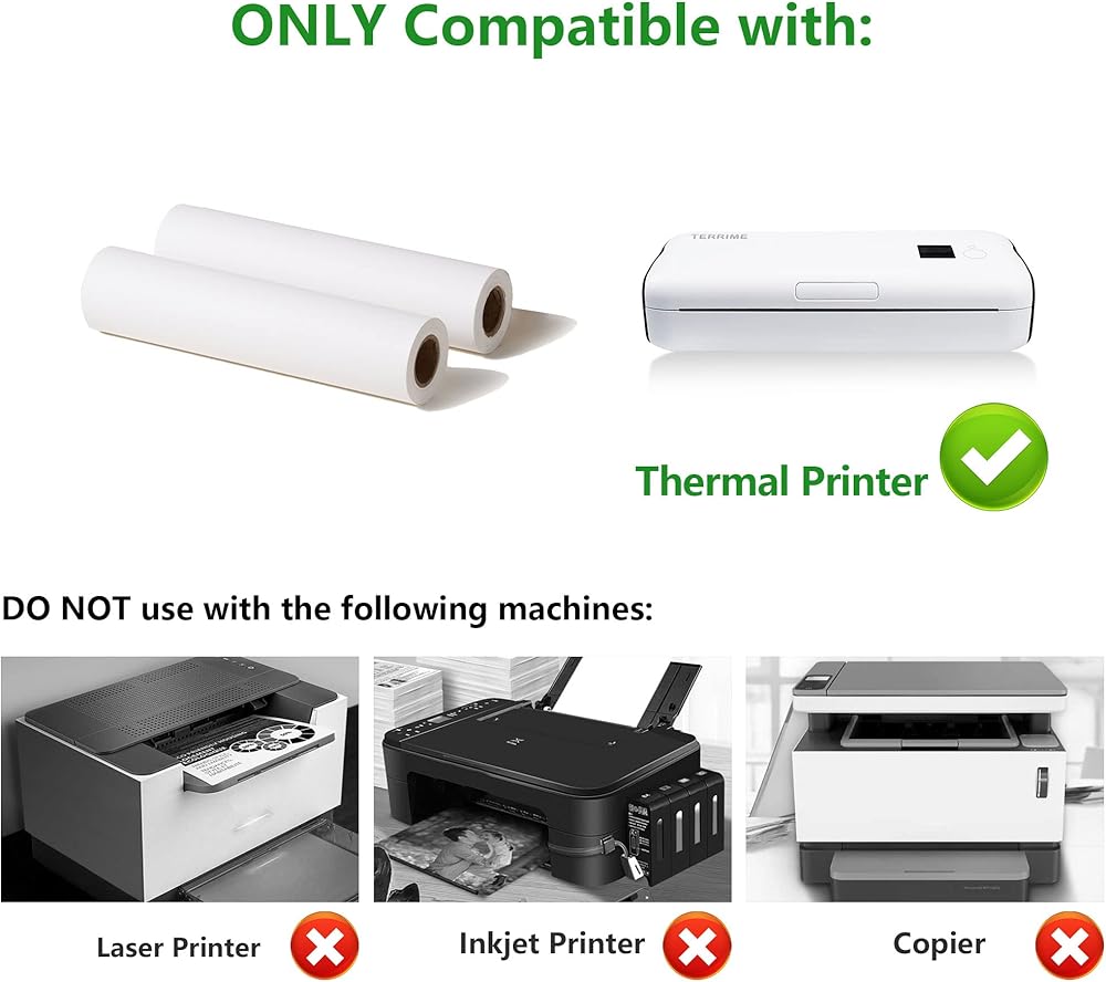 • متوافقة مع طابعة TERRIME الحرارية فقط: أوراق TERRIME A4 الحرارية متوافقة فقط مع طابعة TERRIME A4 الحرارية. يرجى ملاحظة أن هذه الأوراق الحرارية غير متوافقة مع أي طابعات حبر/مسحوق حبر أو طابعات حرارية من أي طراز آخر.