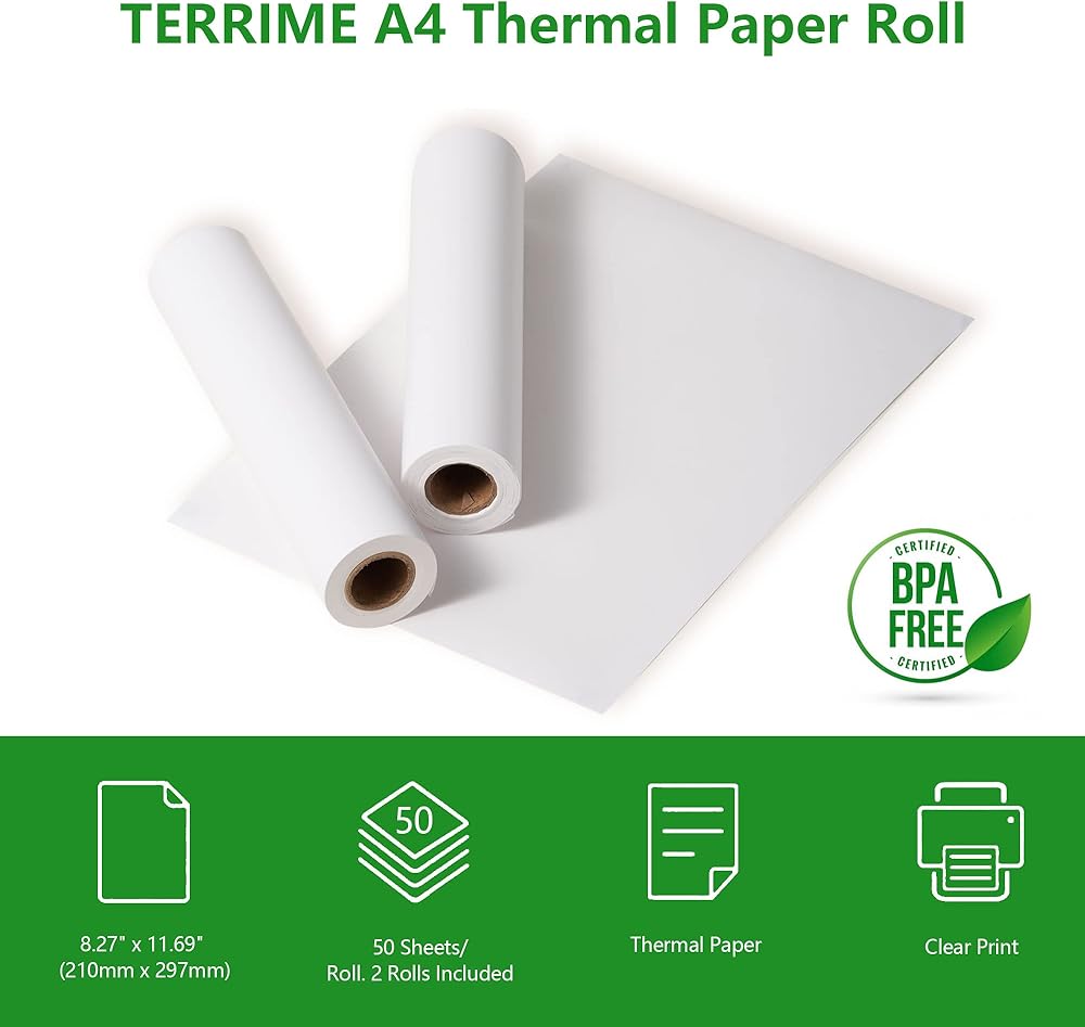 ورق حراري مباشر A4 للطابعة الحرارية المحمولة Terrime A4، ورق لف مقاس 8.27 × 11.69 بوصة، خالي من مادة BPA، 50 ورقة/لفة (عبوتان)