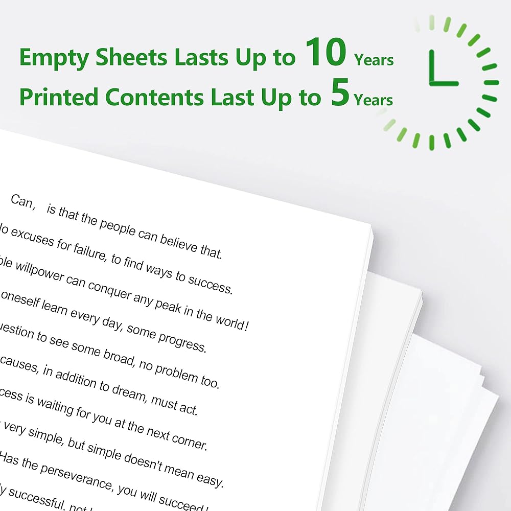 • عمر تخزين طويل للغاية لمدة 5 أو 10 سنوات: عند الحفاظ على هذه الأوراق الحرارية A4 بشكل صحيح، يمكن الاحتفاظ بها لمدة تصل إلى 10 سنوات. بمجرد طباعتها، يمكن أن تظل المواد المطبوعة قابلة للقراءة بوضوح لمدة تصل إلى 5 سنوات. شروط التخزين: 1. يخزن في درجة حرارة الغرفة وتجنب أشعة الشمس المباشرة. 2. تجنب ملامسة مواد مثل المذيبات والملدنات والزيت والماء.