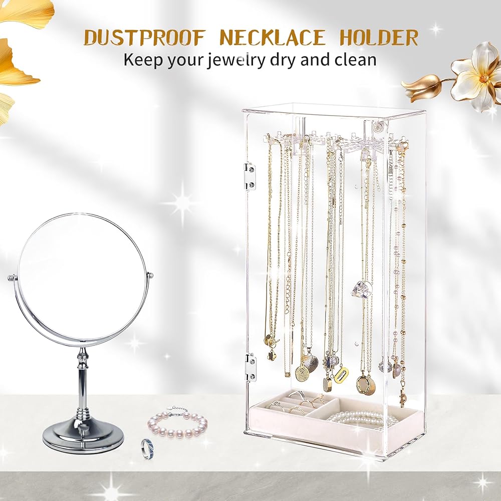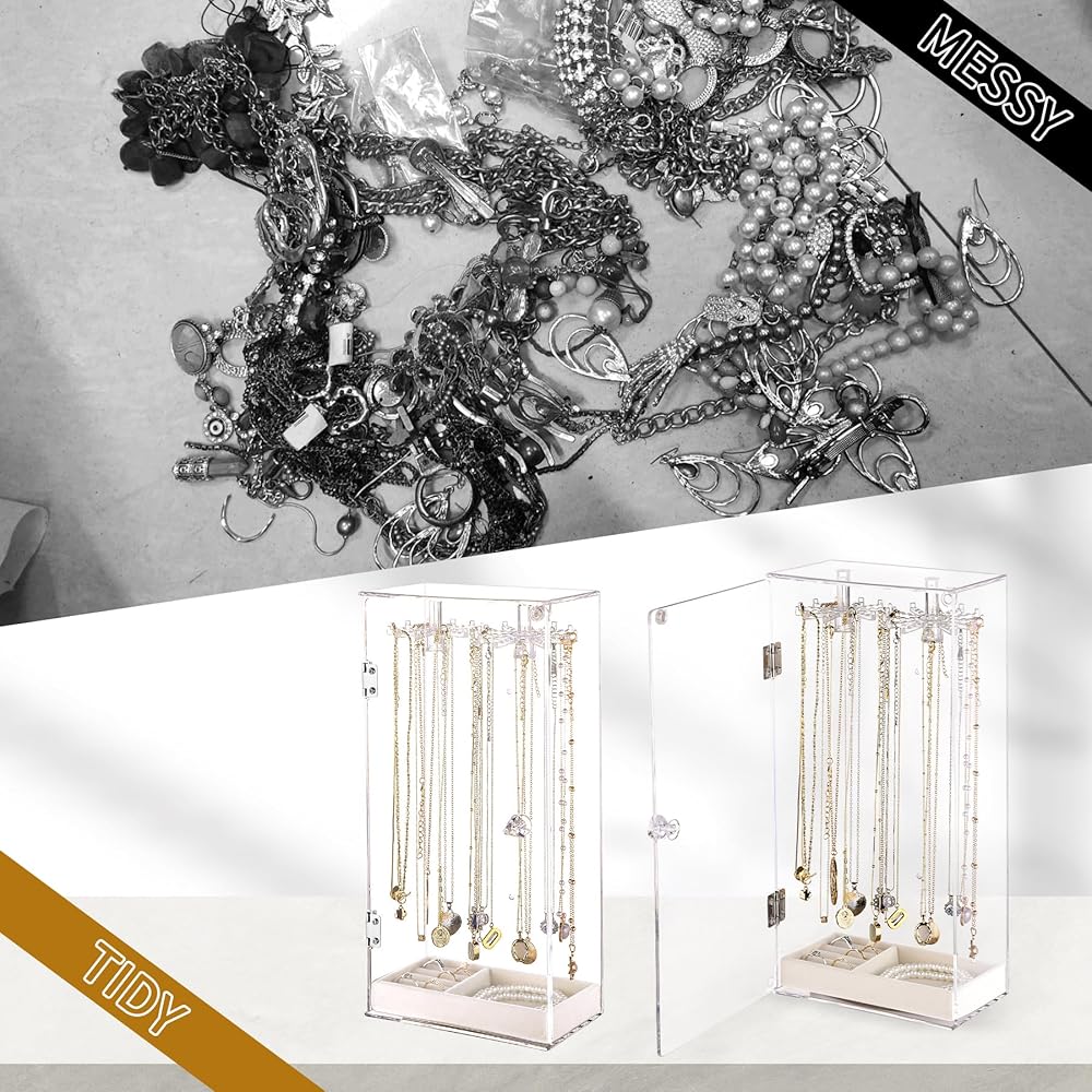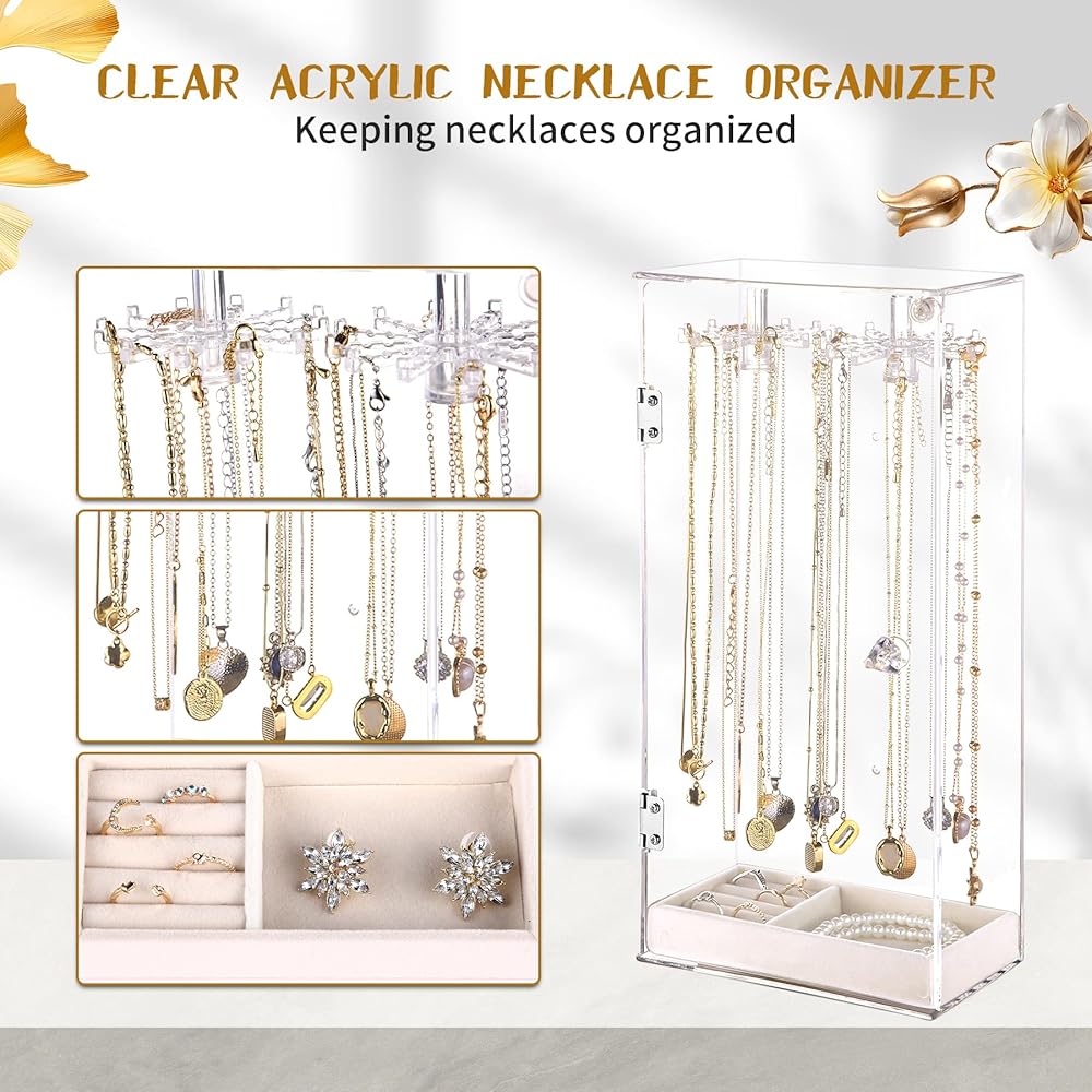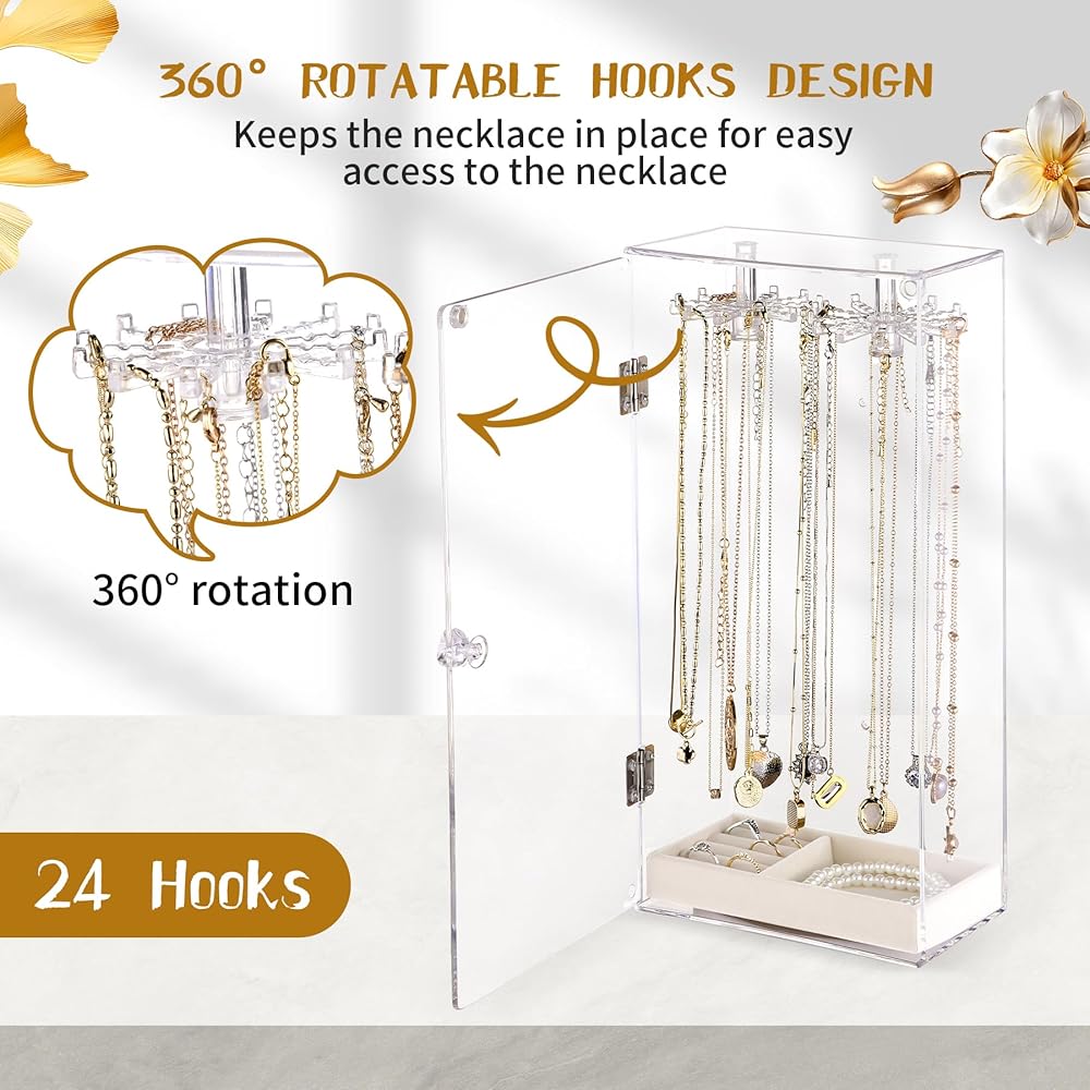 منظم حامل القلادة، حامل عرض القلادة، صندوق القلادة، حامل المجوهرات المنظم، منظم المجوهرات الشفاف من الأكريليك، عرض القلادة، علبة عرض المجوهرات، دوران مع 24 خطافًا