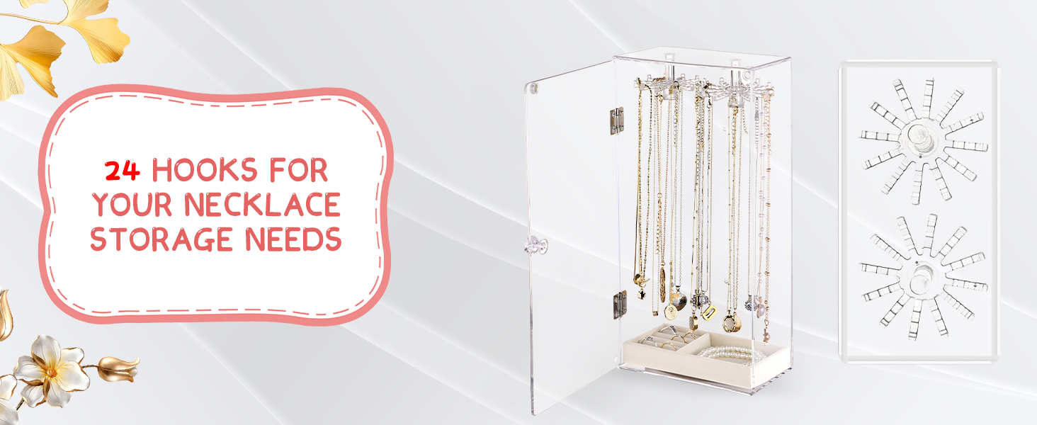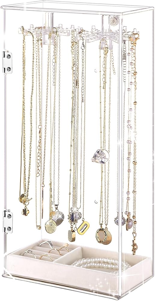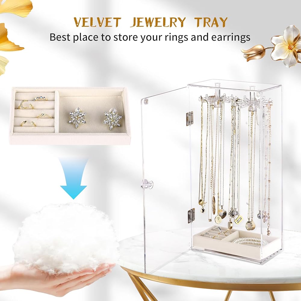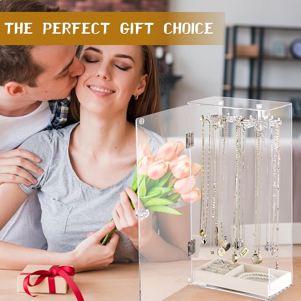 منظم حامل القلادة، حامل عرض القلادة، صندوق القلادة، حامل المجوهرات المنظم، منظم المجوهرات الشفاف من الأكريليك، عرض القلادة، علبة عرض المجوهرات، دوران مع 24 خطافًا