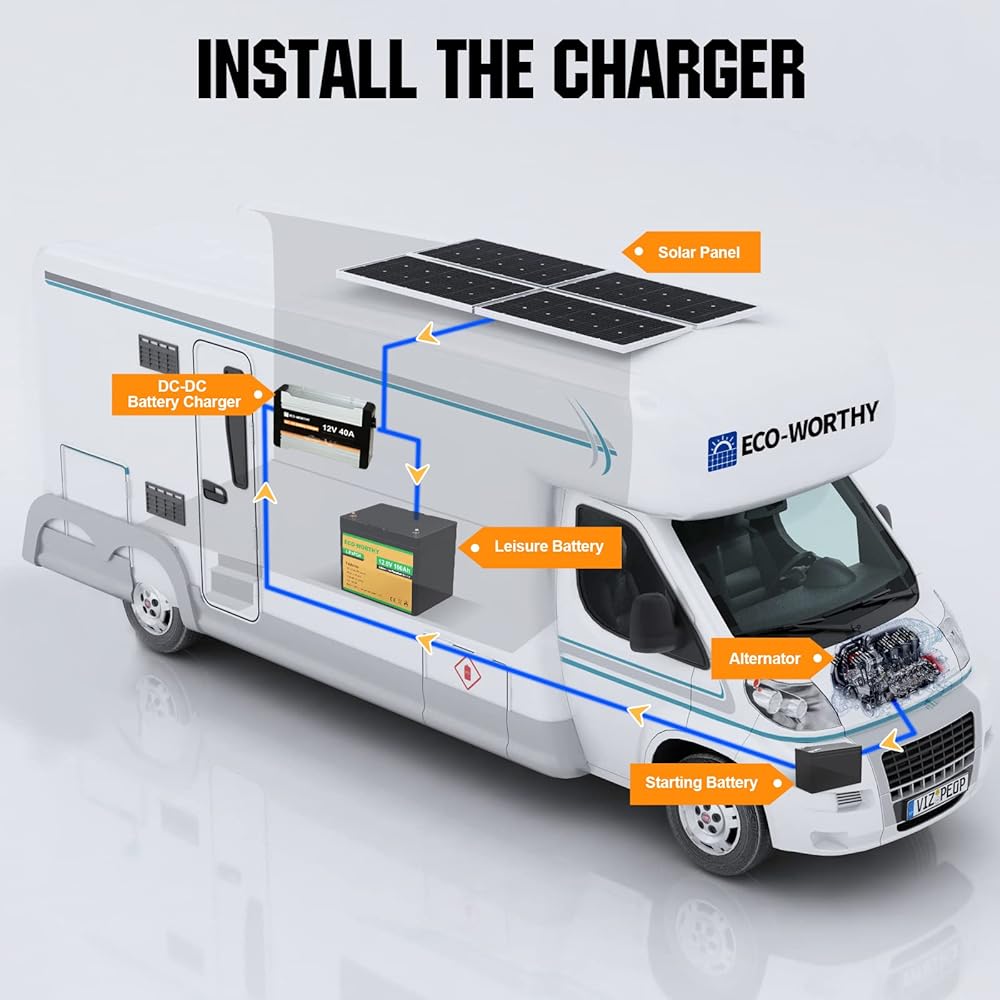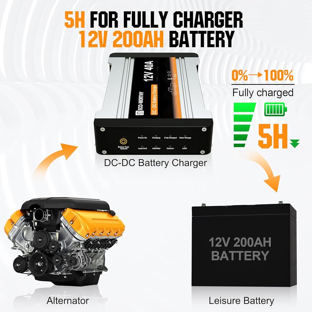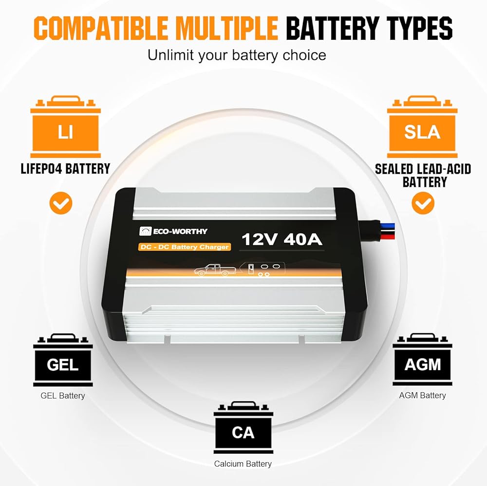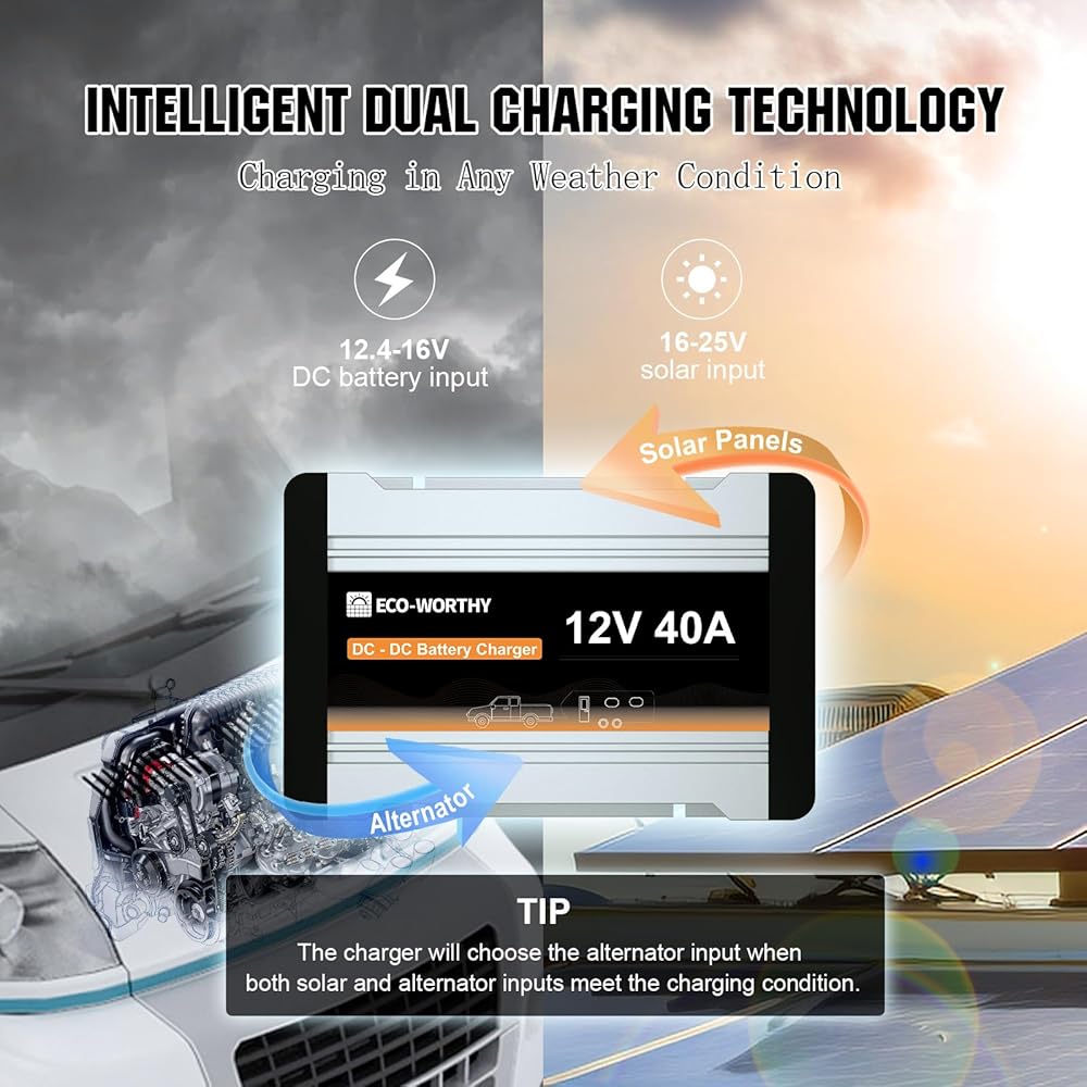 [شحن فعال متعدد المدخلات] شاحن DC-DC صديق للبيئة مع جهاز تحكم في الشحن بالطاقة الشمسية مدمج. شاحن 2 في 1 مع إدخال بطارية بدء تشغيل المولد ومدخل اللوحة الشمسية، يمكنه شحن أنواع مختلفة من البطاريات. مناسبة لبطاريات AGM/GEL وحمض الرصاص والليثيوم والكالسيوم.