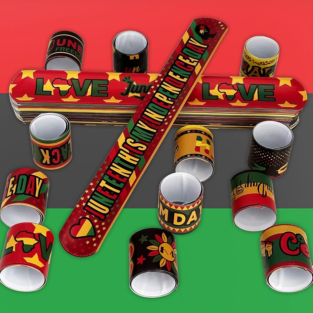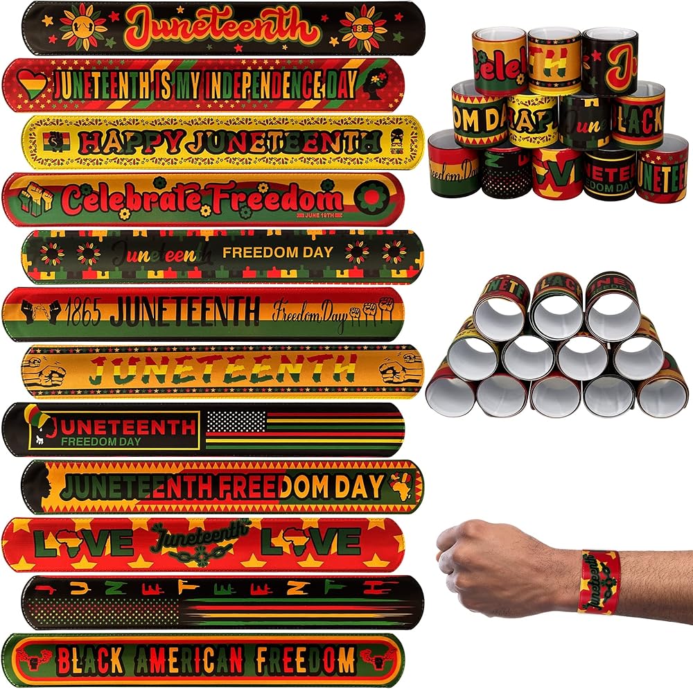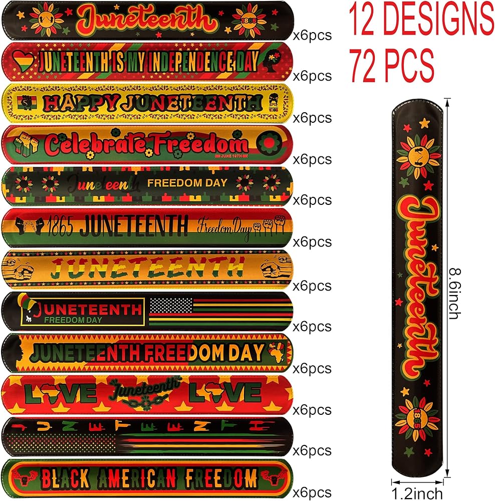 these slap bracelets set includes 72pcs of 12 styles Freedom Day Juneteenth slap bracelets.