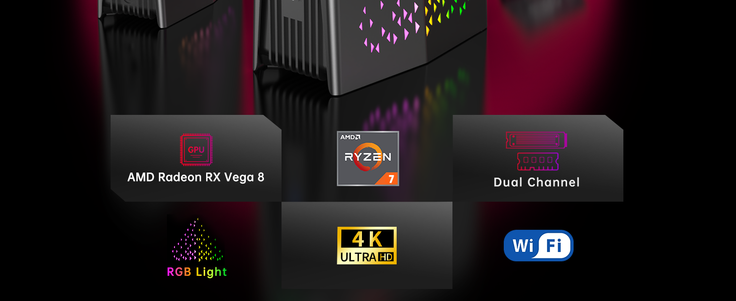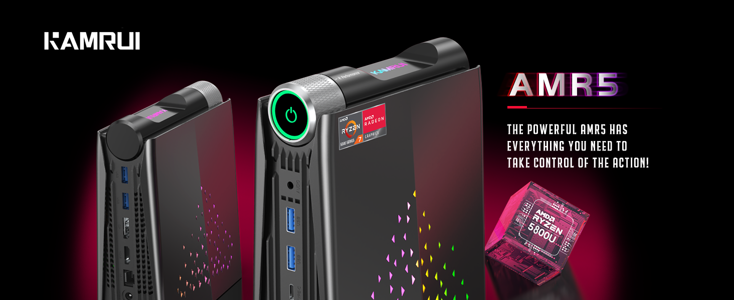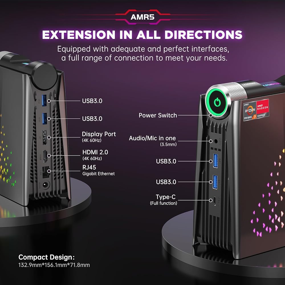 كمبيوتر صغير يحتوي على كل شيء: يأتي الكمبيوتر الصغير AMR5 مع USB3.0 Type-A×4، HDMI 2.0×1، منفذ عرض×1، Type_C (وظيفة كاملة)×1، صوت/ميكروفون×1، RJ45×1 و جاك تيار مستمر × 1. واجهات كافية لمجموعة كاملة من التحكم في الاتصال. إنها مجهزة بأضواء RGB على الجانب، مما يوفر ثلاثة أوضاع إضاءة مختلفة لتختار من بينها. هذا كمبيوتر ألعاب صغير غير مسبوق يخلق جوًا غامرًا من خلال تأثيرات إضاءة RGB.
