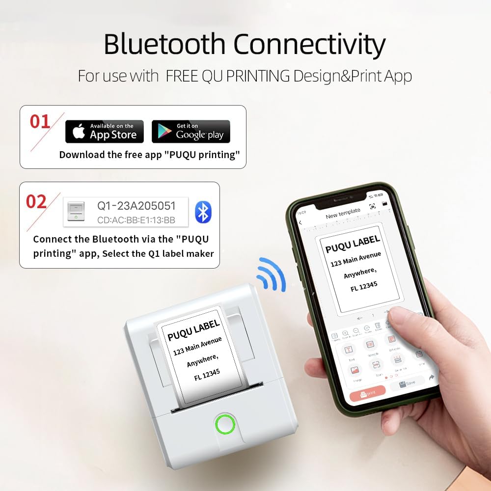Connect In a Breeze Through Your Smart phone-Just connects through your smart phone and have your labels printed in no time! Bluetooth connectivity through free PUQU printing app allows for consistent support for Android and iOs. Save yourself the torture of disrupted connection that so often torments users of similar Bluetooth label makers!