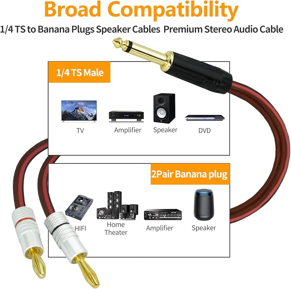 تتصل كابلات مكبر الصوت 1/4 TS إلى Banana Plugs بسهولة بمعدات الصوت، كما أن منطقة الاتصال الكبيرة والدرع القوي يجعلها خيارًا رائعًا لتطبيقات مثل DJs.