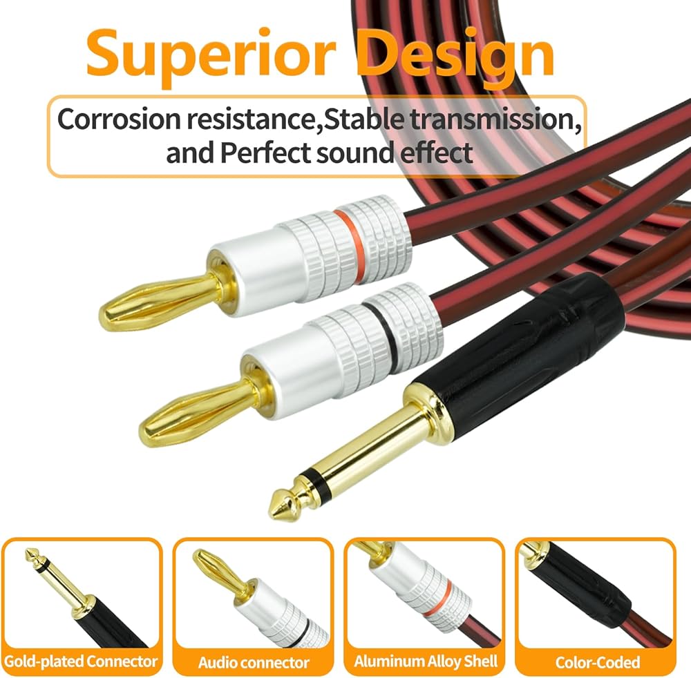 تتميز قوابس TS والموز المطلية بالذهب بالكابل بأنها مقاومة للأكسدة ومحمية بشكل جيد، في حين توفر سترة PVC المرنة للغاية متانة ممتازة ومقاومة للشيخوخة والتشقق والماء. استخدم هذا الكابل لنقل الصوت الأمثل والصوت عالي الدقة.