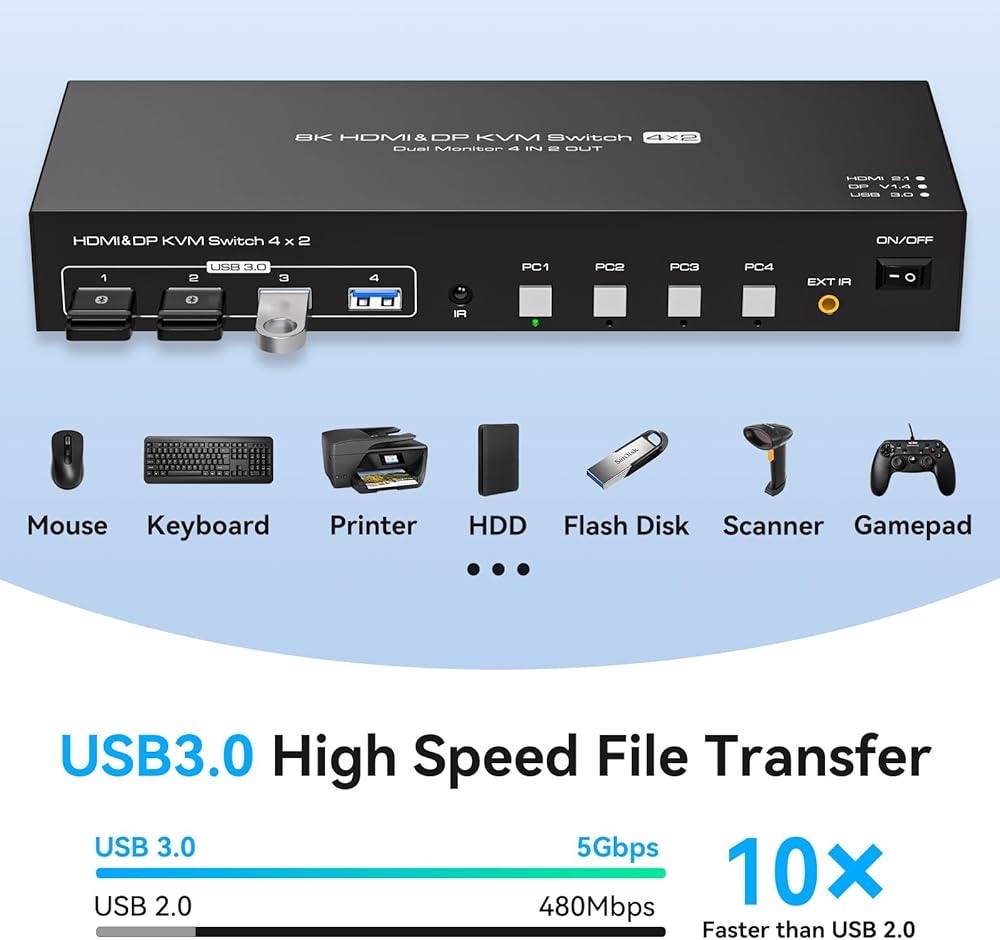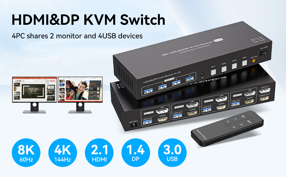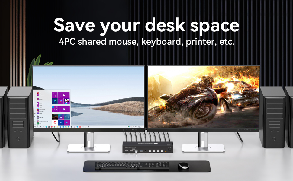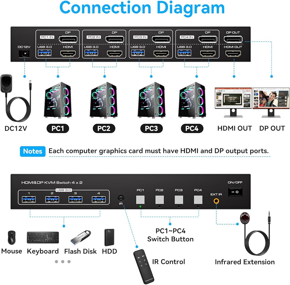 【مفتاح KVM】تسمح الشاشة المزدوجة بمفتاح KVM لـ 4 أجهزة كمبيوتر بمشاركة شاشتين و4 أجهزة USB3.0. على سبيل المثال، الفئران ولوحات المفاتيح والطابعات وما إلى ذلك. ما عليك سوى استخدام جهاز التحكم عن بعد أو زر التبديل الموجود على اللوحة للتبديل بسهولة بين أجهزة الكمبيوتر الأربعة. ملاحظة: يجب أن يحتوي كل كمبيوتر على منفذ HDMI ومنفذ DP.