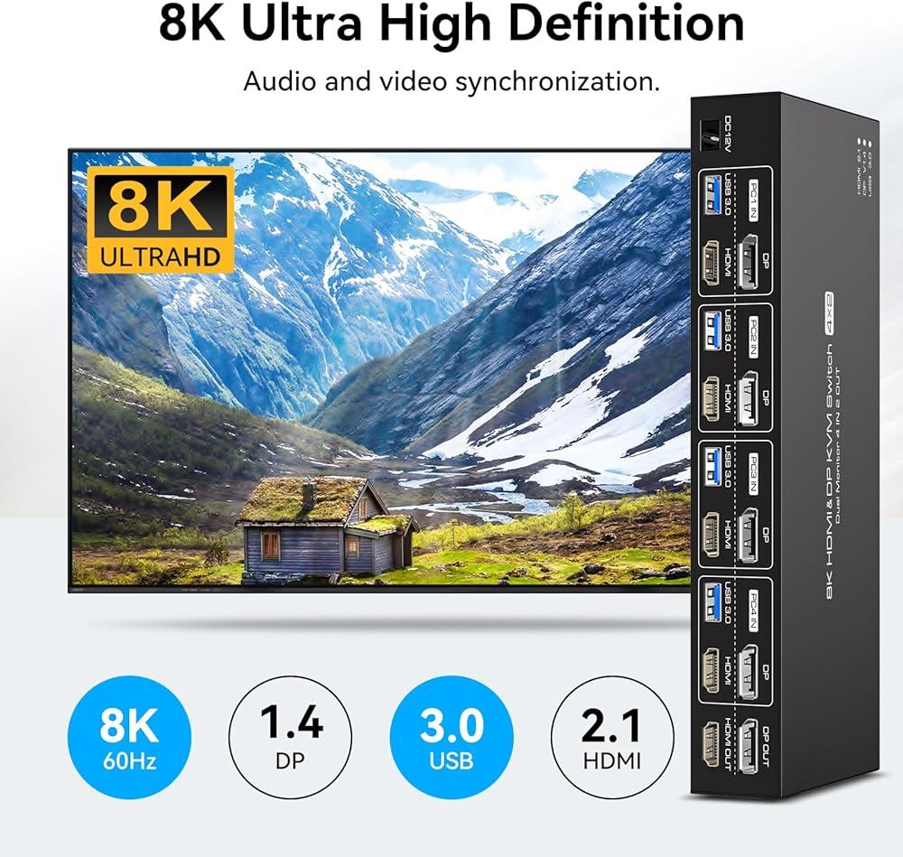 【دقة فائقة الدقة 8K@60 هرتز】يدعم محول kvm دقة مذهلة تصل إلى 8K@60 هرتز. تتيح لك الدقة العالية الوضوح عرض الصور بألوان أكثر تفصيلاً وحيوية، مما يعد متعة حقيقية للعيون. كما أنه متوافق أيضًا مع دقة 4K@144 هرتز، و4K@120 هرتز، و1080P@60 هرتز، و720P@60 هرتز. ملحوظة: لتحقيق أعلى دقة، تأكد من أن المصدر وكابل HDMI وكابل DP يدعمون 8K@60 هرتز.