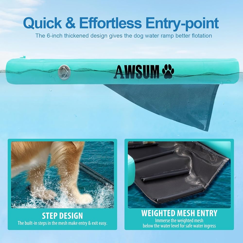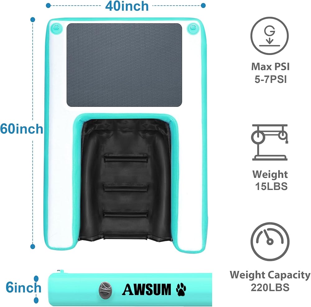 منحدر مائي قابل للنفخ للكلاب، سلالم عائمة كبيرة جدًا للكلاب يصل وزنها إلى 220 رطلًا، على درجات سلم مائية لحمام السباحة والبحيرة والقوارب والرصيف، مع وسادة مضادة للانزلاق