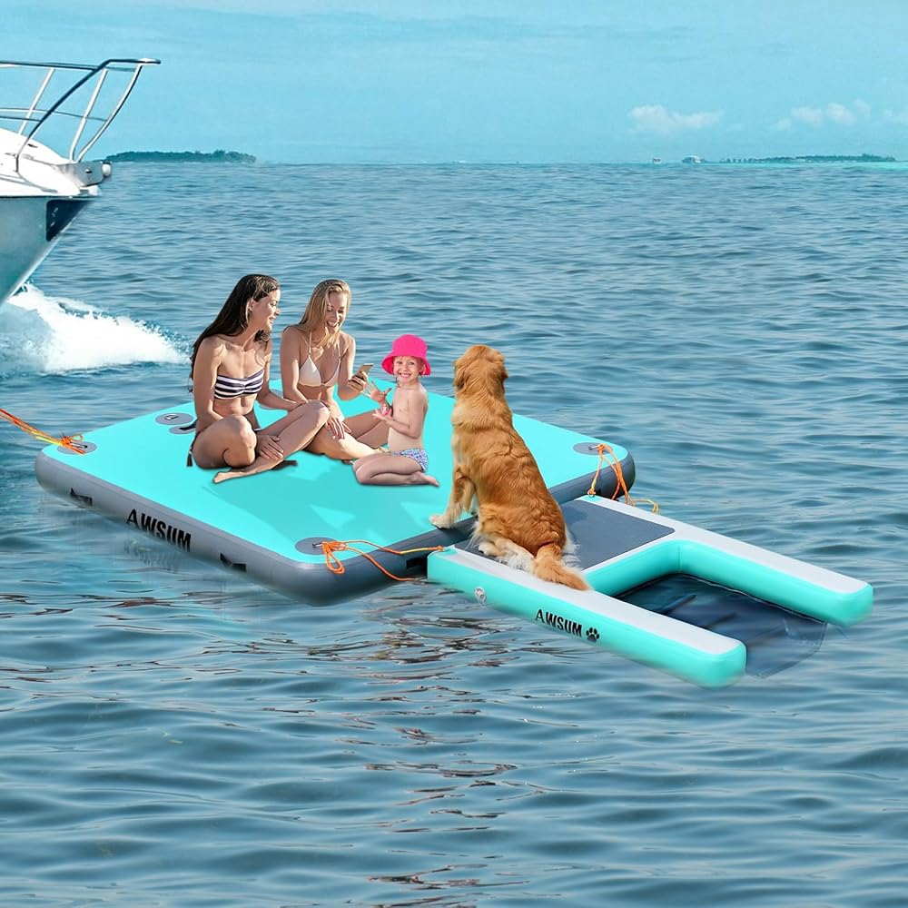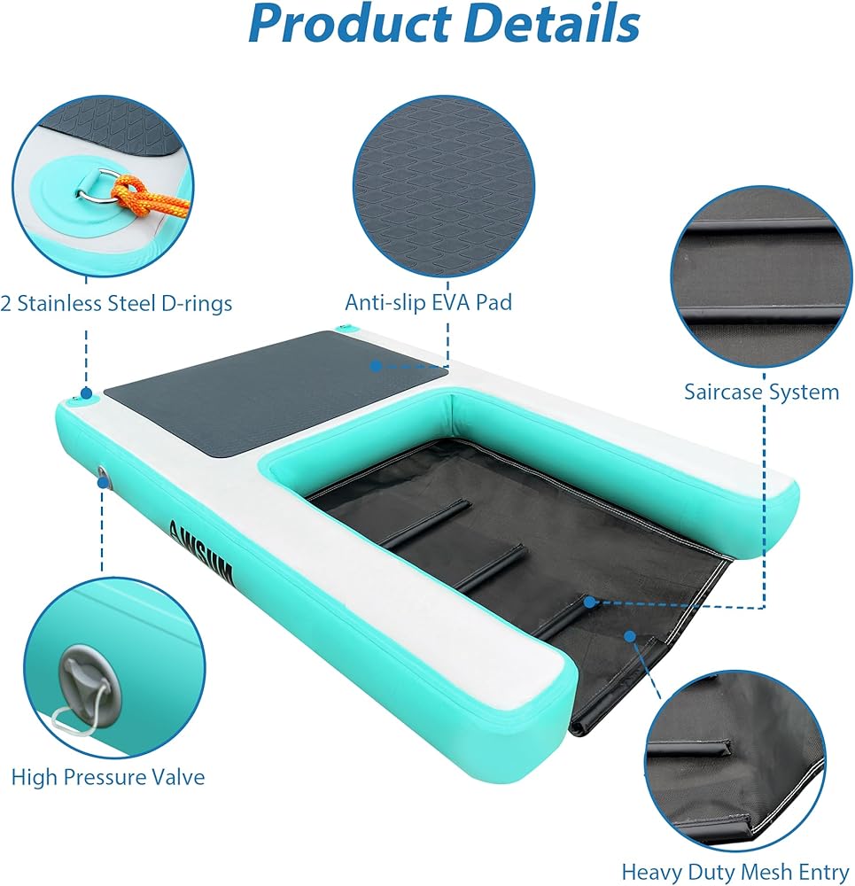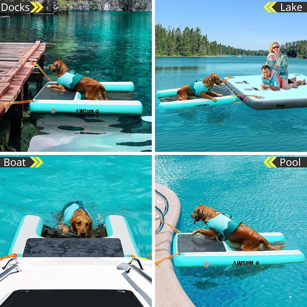 【موثوق ومتين】تم تجهيز منحدر قارب الكلاب الكبير جدًا بوسادات مضادة للانزلاق لضمان أن صديقك المكسو بالفراء يمكنه التسلق بسهولة لأعلى ولأسفل دون الانزلاق ويمكنه الاستلقاء عليه بثبات. منحدر الكلاب لحمام السباحة مصنوع من سطح PVC سميك من الدرجة الصناعية من أجل متانة مقاومة للتمزق والخدش للاستخدام طويل الأمد. تسمح تقنية التماس المعززة للمنصة الهوائية بالحفاظ على ضغط الهواء الأمثل لعدة أيام.