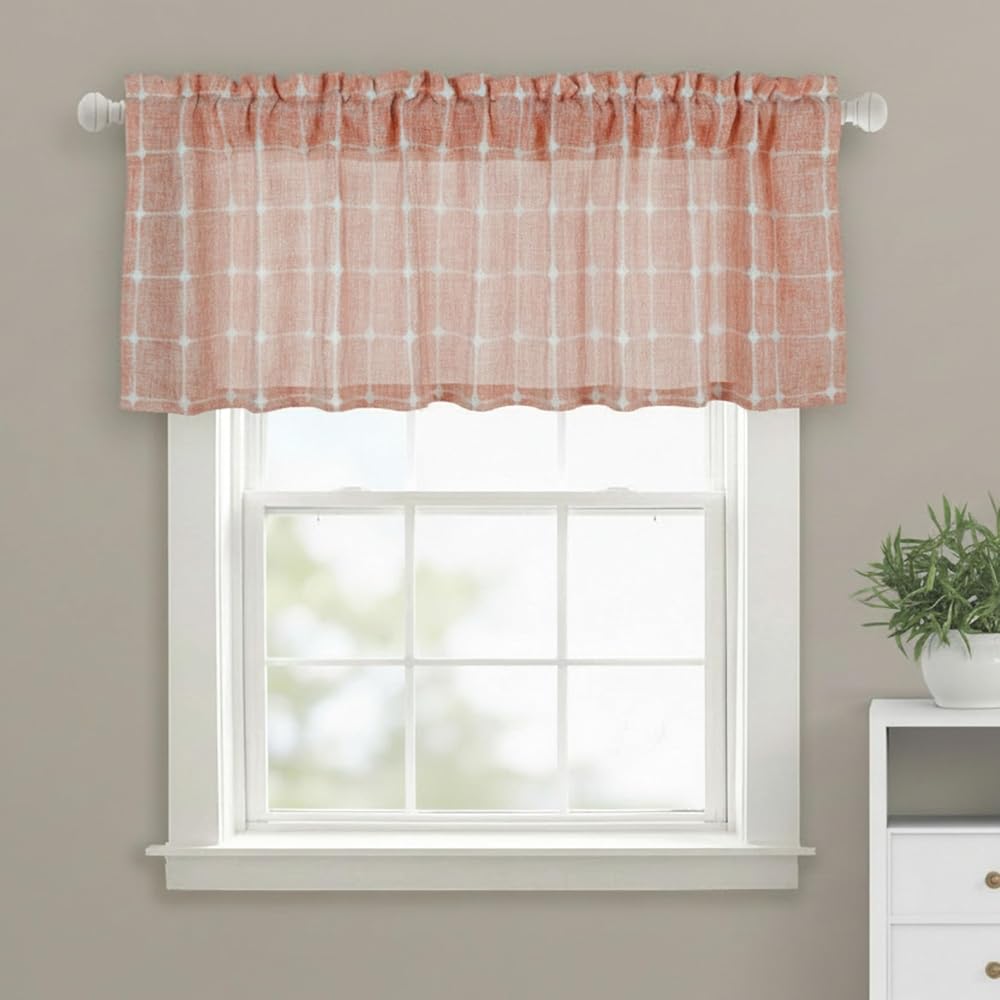 The curtain valance is made of 100% polyester slub faux burlap fabric with a classic plaid embroidery design that is medium-weight, durable, resistant to fading and deformation, and will stand the test of time.