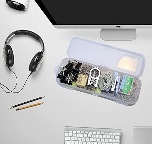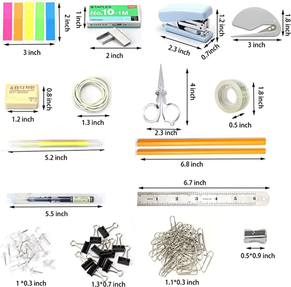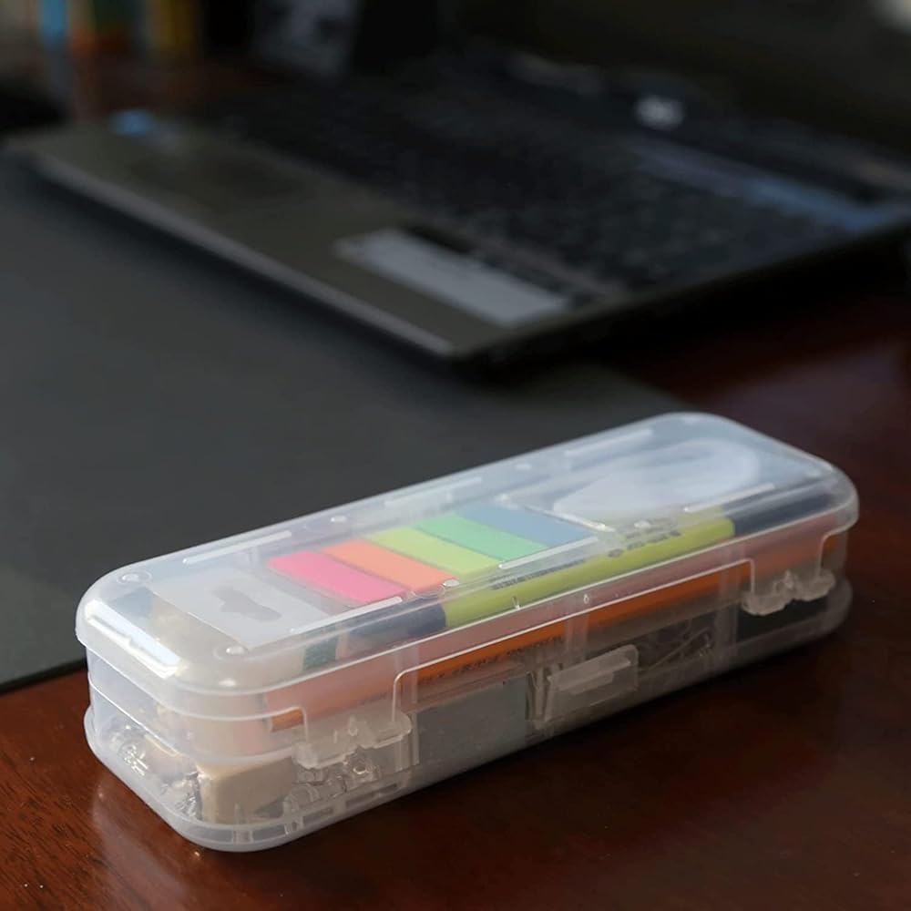 This is a portable office supplies kit includes Binder Clips*12, Sharpener*1, Paper Clip*80, Stapler*1, Staples*1000, Rubber Band*12, Eraser*1, Clear Push Pin*18, Letter Opener*1, Page Marker*5, Steel Ruler*1, Pencil*2, Highlighter*1, Black Pens*3, Steel Scissor*1, Clear Tape*1,Clear Pencil Box* 1