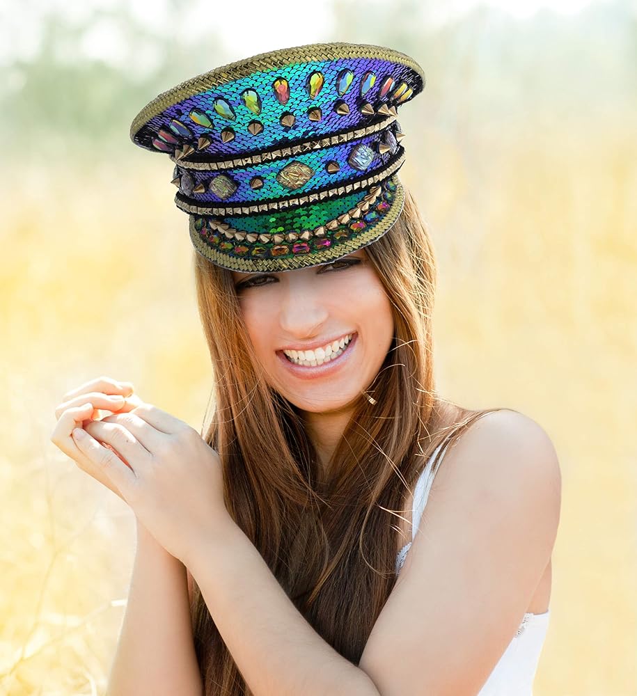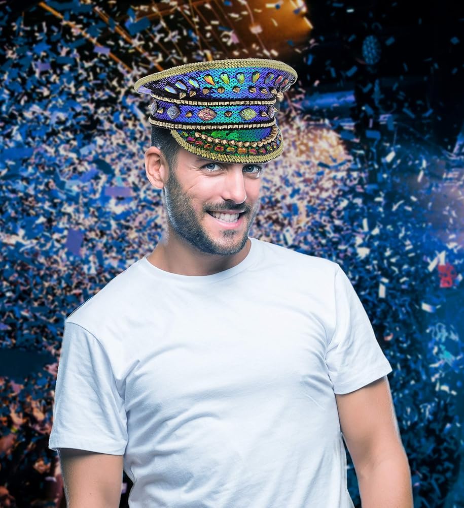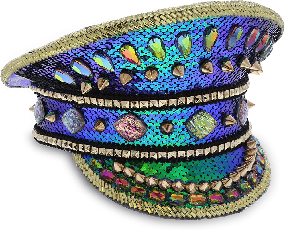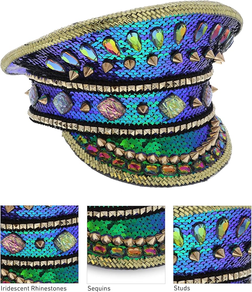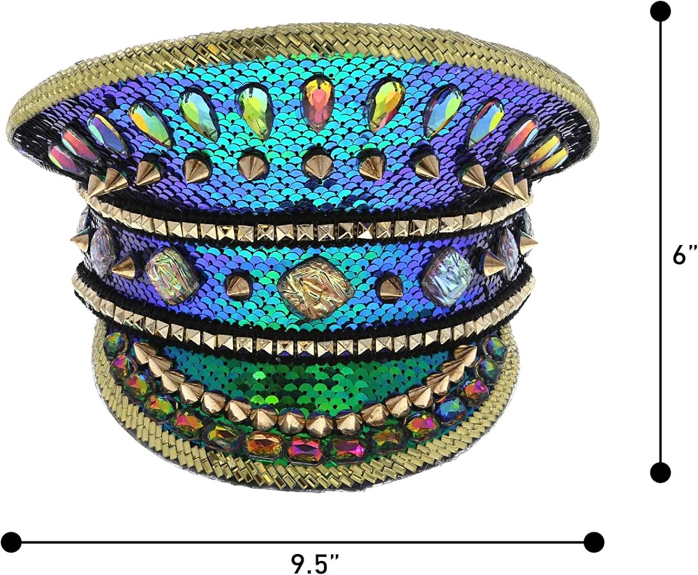 قبعة من حجر الراين الأزرق عالية الجودة مع أزرار - قبعة نظارات Steampunk مصنوعة من مواد عالية الجودة لن تتمزق أو تنكسر بسهولة. إكسسوار زي قوي ومتين يدوم لاستخدامات متعددة، كما أنه سهل الاستخدام ومريح في التخزين. القبعة مزينة بقماش لامع مزين بالترتر بألوان قوس قزح وأحجار الراين الأنيقة على شكل جوهرة ومسامير ذهبية في كل مكان.