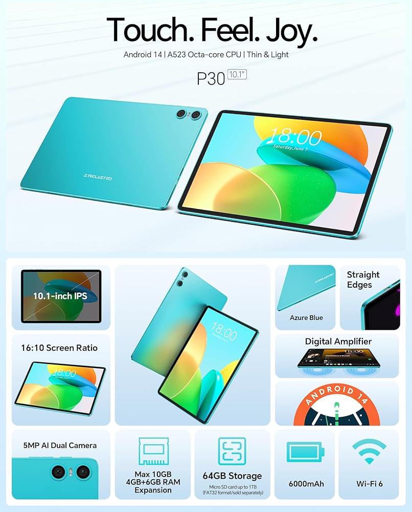 【وحدة المعالجة المركزية 10 جيجابايت + 64 جيجابايت / 8 النواة 】جهاز لوحي TECLAST Android 14 مع ذاكرة وصول عشوائي 10 جيجابايت (ذاكرة وصول عشوائي افتراضية 4 جيجابايت + 6 جيجابايت) وذاكرة وصول عشوائي 64 جيجابايت، مساحة تخزين قابلة للتوسيع حتى 1 تيرابايت من بطاقة SD الصغيرة (تنسيق FAT32/تُباع بشكل منفصل)، يمكنك الاستمتاع دون إجهاد الصور والأفلام والفصول الدراسية عبر الإنترنت والتعلم الافتراضي ومؤتمرات الفيديو والعمل المكتبي والمزيد. ◆جهاز لوحي يعمل بنظام Android مزود بمعالج Allwinner A523 الذي تم طرحه حديثًا، والمصمم بتصميم معماري A55 ثماني النواة. هذا هو 4 نواة معززة بشكل كبير، مما يحقق زيادة في الأداء تزيد عن 6 أضعاف أداء A53. ◆ تستخدم وحدة معالجة الرسوميات Mali-G57 المثبتة في طراز P30 اللوحي المزود بتقنية Wi-Fi خوارزميات ذكية لتحسين لون الشاشة وتفاصيلها حتى تتمكن من الاستمتاع بألعابك