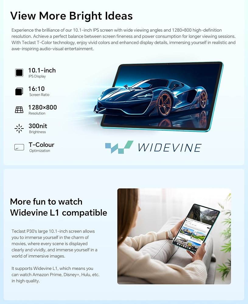 【جهاز لوحي Widevine L1 / شاشة IPS 10.1】هذا الجهاز اللوحي الذي يعمل بنظام Android مع شاشة TDDI مقاس 10.1 بوصة بدقة 1280*800، ونسبة عرض ذهبية تبلغ 16:10، وزاوية عرض واسعة IPS تبلغ 178 درجة. يعد الجهاز اللوحي مقاس 10 بوصات مثاليًا لمشاهدة مقاطع الفيديو وتصفح مواقع الويب والقراءة الليلية المريحة. ◆ تُظهر الأجهزة اللوحية المتوافقة مع Widevine L1 أنه يمكنك مشاهدة Amazon Prime Video وDisney+ وHulu وما إلى ذلك بجودة عالية. (Netflix لا يدعم التشغيل عالي الدقة). ◆ مزود بوظيفة فتح القفل للتعرف على الوجه، مما يسمح بالتشغيل السلس. ◆ يحتوي الجهاز اللوحي الذي يعمل بنظام Android مقاس 10 بوصة على بطارية مدمجة بقوة 6000 مللي أمبير في الساعة تصل إلى 8 ساعات من الاستخدام، مما يجعله مثاليًا للتنقل اليومي والسفر احتياجات الترفيه أثناء التنقل