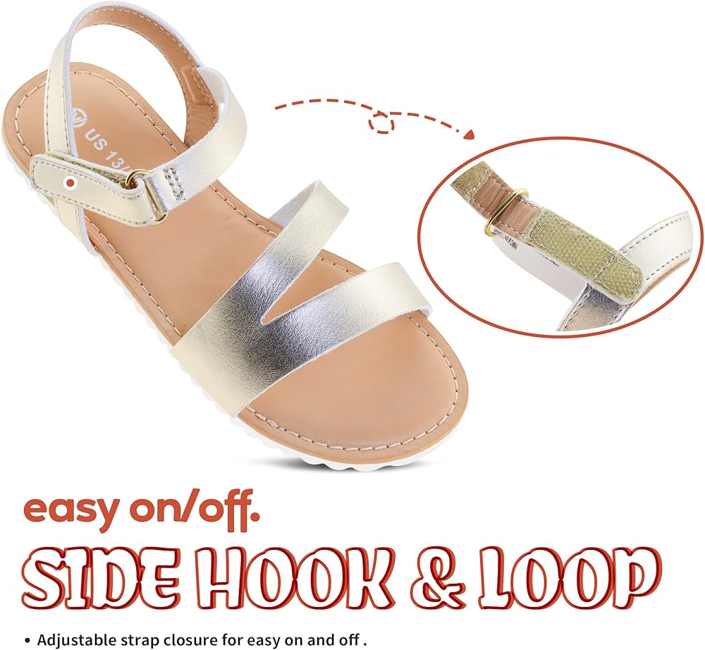 EASY ON AND OFF: Adjustable side hook and loop closure makes sandals for girls easily putting on and taking off. Convenience for your little princess to wear these great sandals themselves.