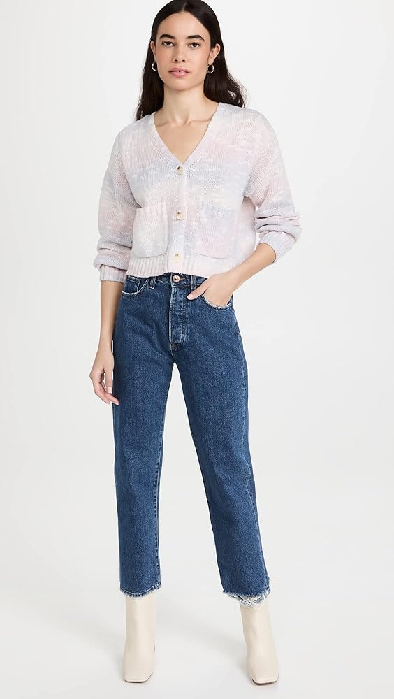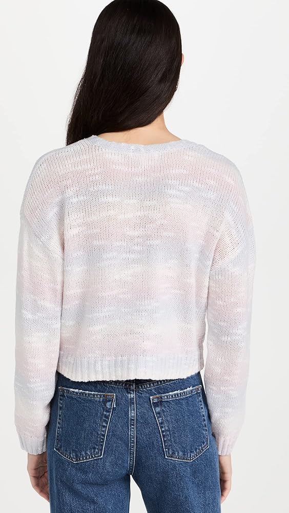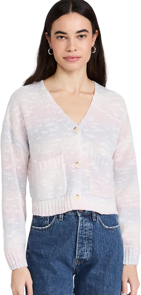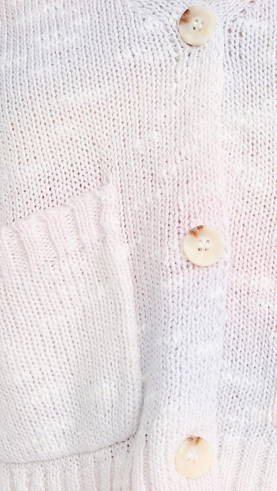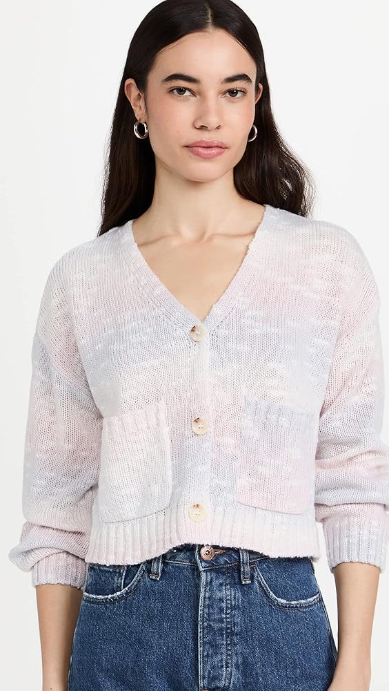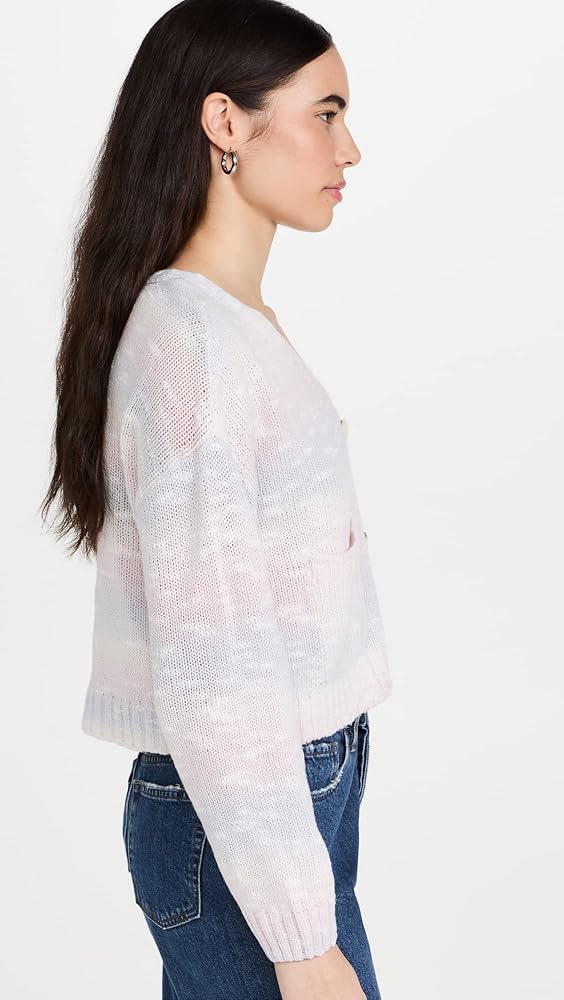 The Cool Vibes Sweater is a cropped cardigan with front pockets. It has pastel pink and purple, space-dye material.