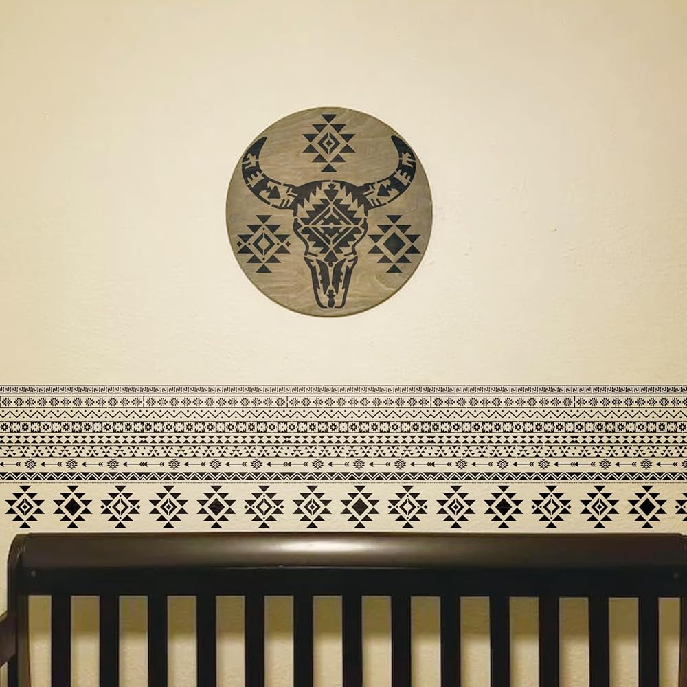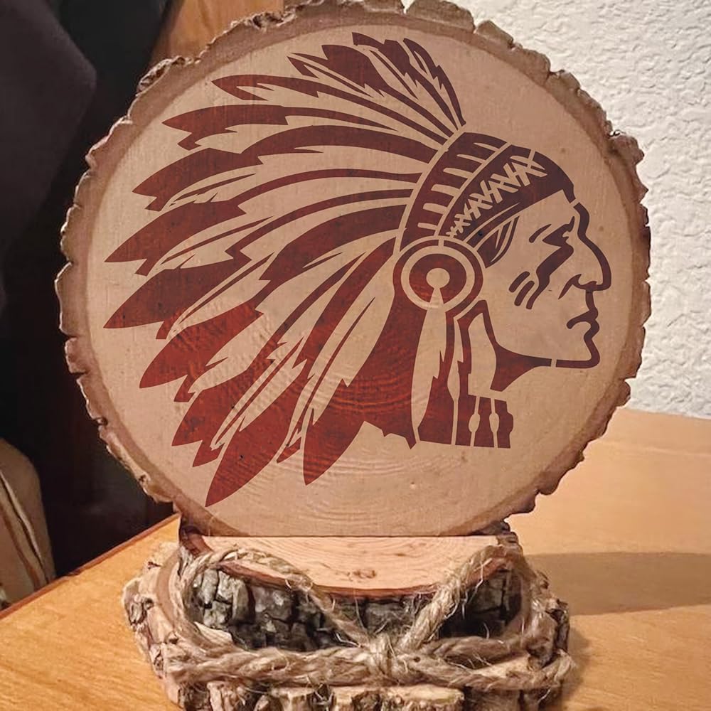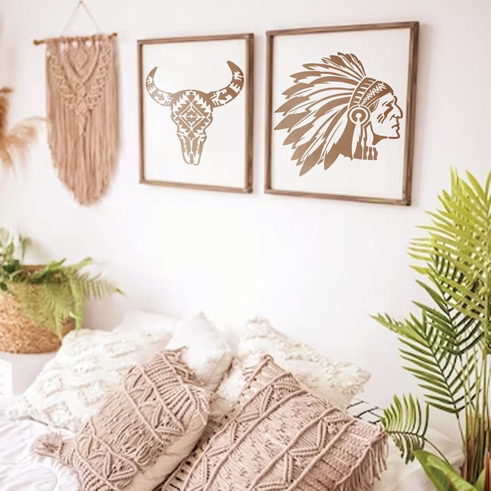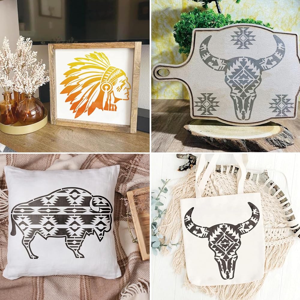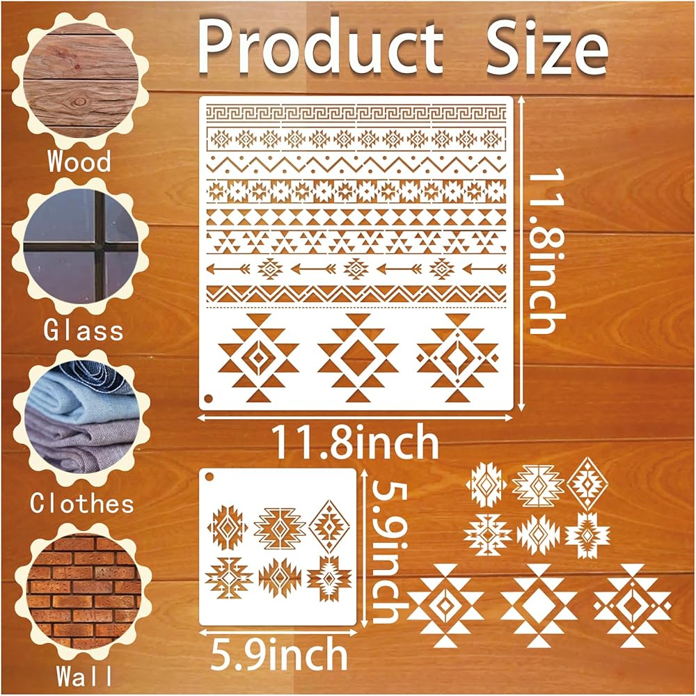 العبوة: استنسل أمريكي أصلي للرسم على الخشب يحتوي على 4 قطع استنسلات طلاء رش كبيرة مقاس 11.8 × 11.8 بوصة مع 4 قطع نمط هندي صغير مقاس 7.87 × 7.87 بوصة، وحلقة تخزين منظمة، سهلة الاستخدام والتخزين والتنظيم.