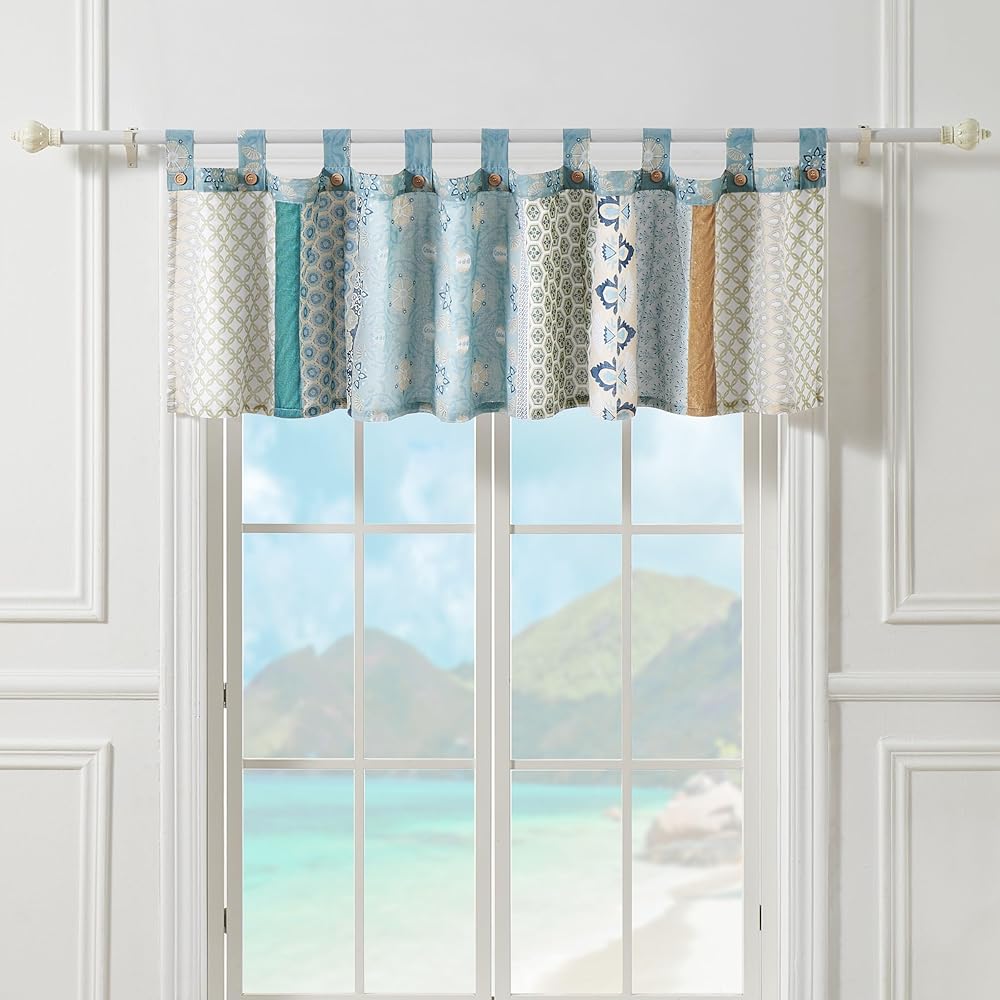 Rows of vivid geometric, foulard and floral prints create distinctive Bohemian styling. The Geneva valance features the latest fashion colors and multi-fabric construction embellished with velvet bands. This multi-fabric construction tab top valance is perfect for any window. 95Percent cotton 5Percent polyester face, 100Percent cotton back (2 ply). tab tops for up to 3 inch rod for hanging. Dimensions: approx. 21 inch long x 84 inch wide, including 3 inch tabs for hanging. Machine washable. Includes button embellishments