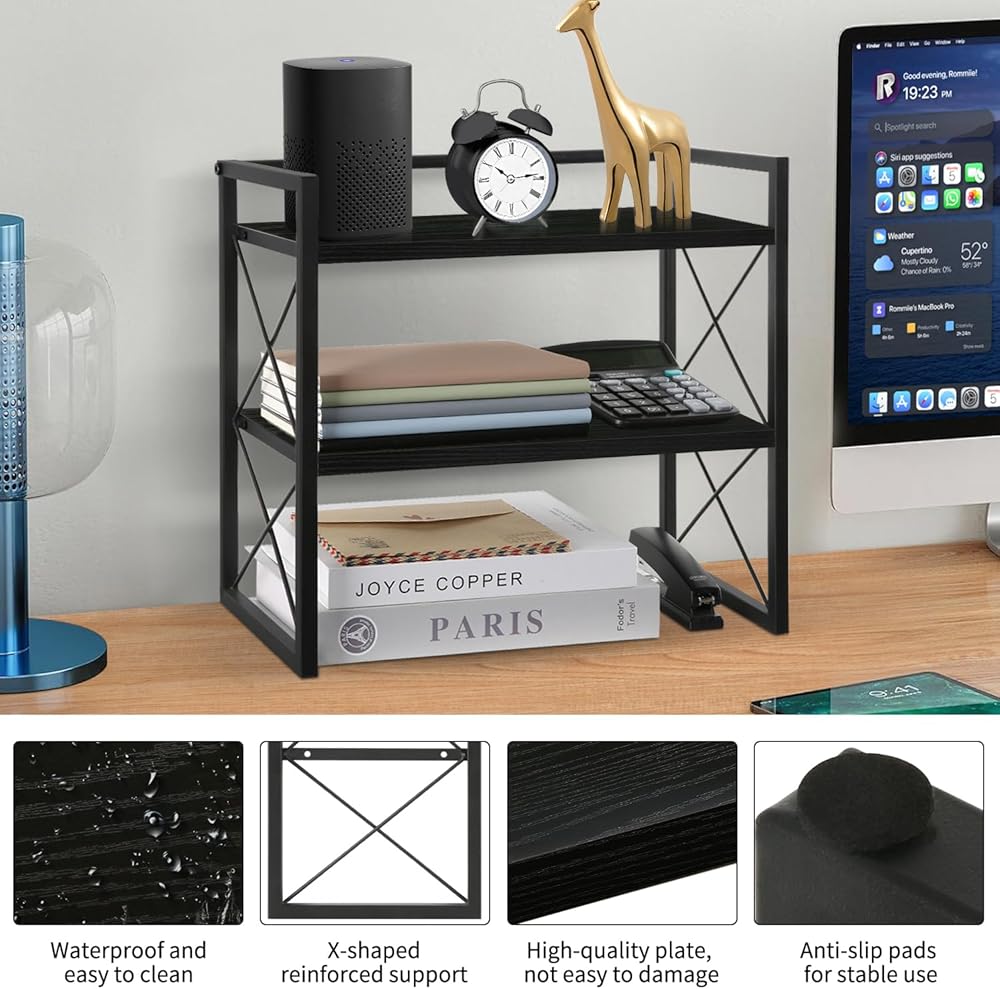 【تصميم موفر للمساحة】: تم تصميم رف سطح المكتب هذا المكون من طبقتين لمساعدتك على زيادة المساحة على مكتبك أو سطح مكتبك. إنها مثالية لتخزين الكتب واللوازم المكتبية ومزهريات التوابل والنباتات وأدوات النظافة والمناشف والتذكارات العزيزة. قل وداعًا للفوضى ومرحبًا بمساحة عمل مرتبة في مكتبك أو مطبخك أو حمامك أو غرفة نومك.
