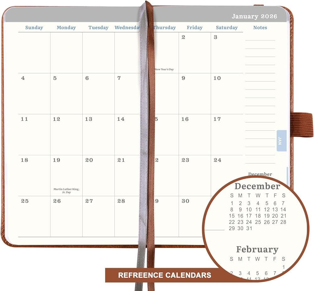 تصميم رائع - مخطط الجيب هذا 2024-2025 مع العطلات الفيدرالية المميزة باللون الأزرق لمساعدتك على تذكير كل عطلة مهمة وإدارة حياتك بكفاءة + تقويم مرجعي لمدة عامين للتحقق السريع من التاريخ + 8 صفحات ملاحظات مسطرة.