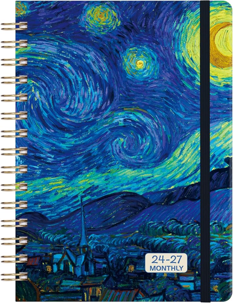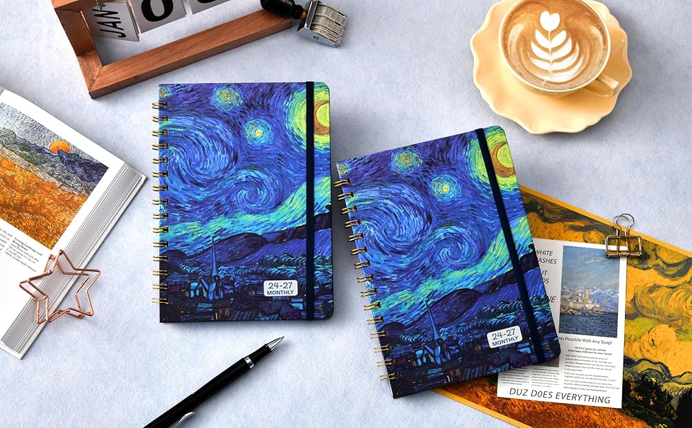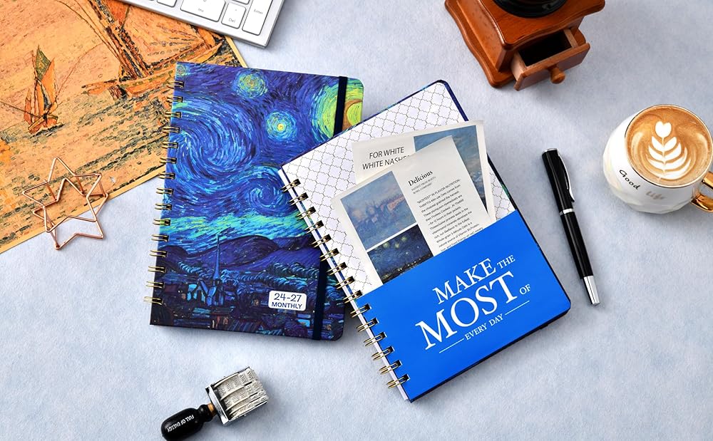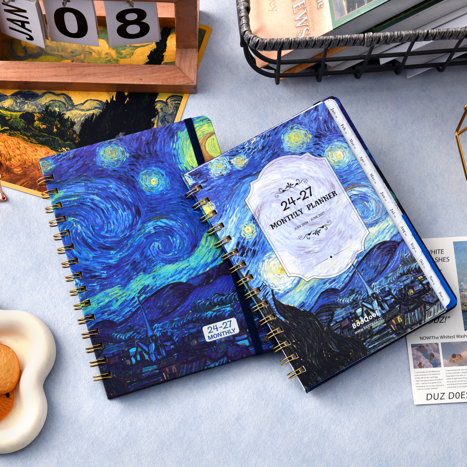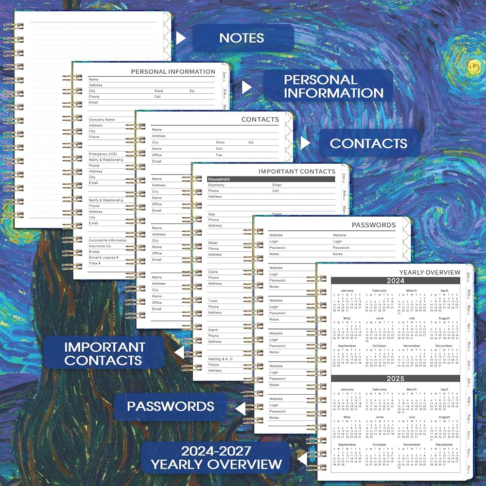 ✍ تصميم مثالي - يتميز غلاف كتاب الثلاث سنوات (يوليو 2024 إلى يونيو 2027) بتصميم ليلي مليء بالنجوم، وهو ملون بتصميم سماء مرصعة بالنجوم باللون الأزرق الداكن. تبدو الورقة ناعمة وتكتب بسلاسة. إن الرابط المعدني القوي والحلقة الحلزونية المسطحة تجعل كتاب التاريخ 2024-2027 هذا متينًا ومقاومًا للتلف.