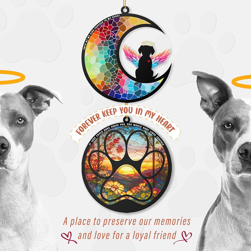 ديكور فريد: إضافة الرقي والشخصية إلى منزلك. سواء تم تعليقها في النافذة، أو وضعها في حديقتك، أو داخل منزلك، فإن Dog Memorial Sun Catcher يحول مساحتك إلى مكان دافئ وجذاب لمحبي الكلاب. انها ليست مجرد زخرفة. إنه رمز للحب والفرح الذي يجلبه كلبك. هذا المنتج لإضافة لمسة شخصية إلى منزلك. ستعمل هذه الميزة الفريدة على رفع مساحة معيشتك وتكريم ذكريات رفيقك المخلص ذو الأرجل الأربعة.