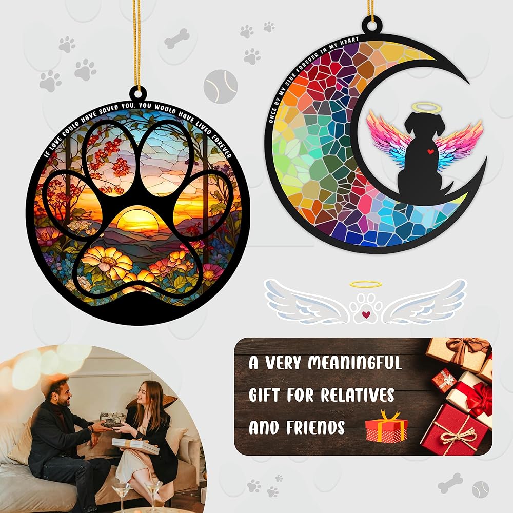هدية مثالية لمحبي الكلاب: يكمن سحر هذا النصب التذكاري الفريد في قدرته على العمل بمثابة لفتة مدروسة لتهدئة أولئك الذين يحزنون على حيوان أليف أو كتذكار لتكريم صديقك الفروي. عند وضعها بجوار النافذة، فإنها تشتت ضوء الشمس، مما يخلق تلاعبًا جميلاً بالألوان يحول المساحة إلى ملاذ دافئ لعشاق الكلاب. إنه تعبير ذو معنى عن الحب والفرح الذي تجلبه الكلاب إلى حياتنا، احتفالاً بالرابطة الاستثنائية بين البشر ورفاقهم ذوي الأرجل الأربعة.