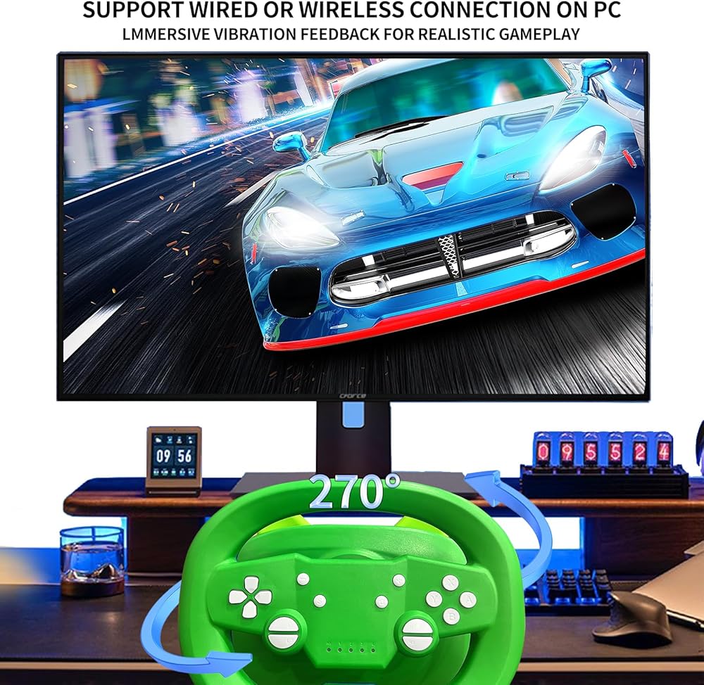 • Pro PC Racing Wheel: Experience immersive gaming with built-in dual-vibration motors, adjustable intensity levels, and advanced sensitivity settings. Supports PC X-input and D-input, with programmable buttons for customization.
