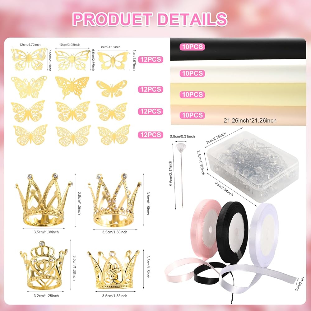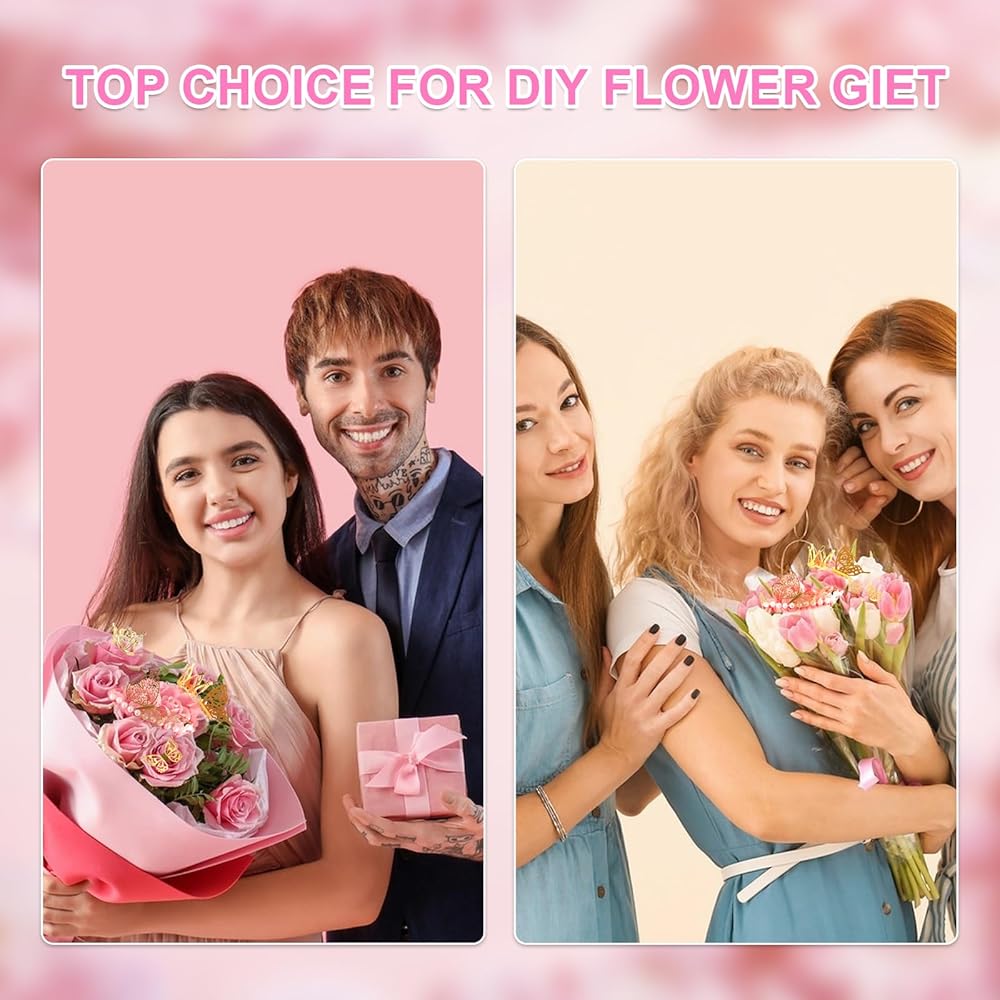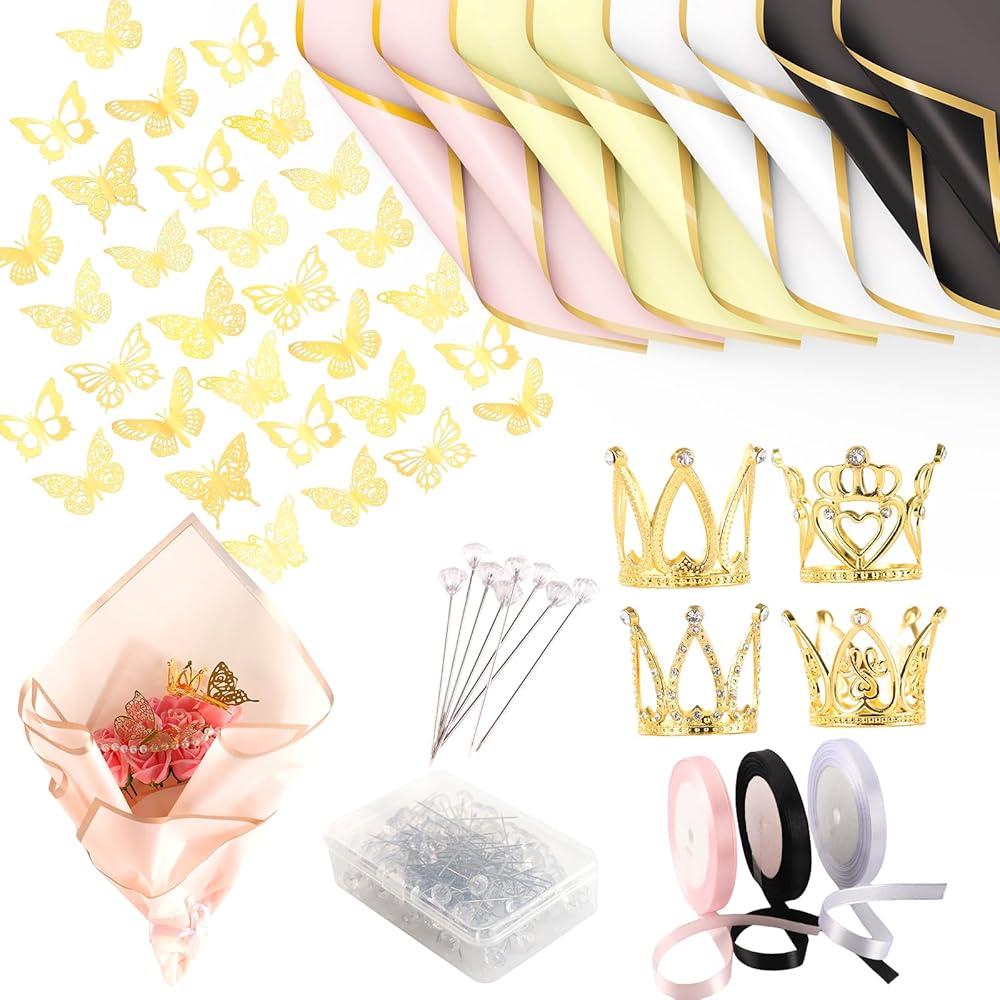 • What You Will Get:You'll receive 40 sheets of floral wrapping paper(10 rose pink,10 white,10 light green and 10 black wrapping paper),4 gold crowns(coronas para ramos buchones de flores), 48 3D gold butterfly decorations(mariposas para arreglos florales), 100 flower pins, and 3 rolls of ribbons(cinta para flores eternas). These flower bouquet supplies provide plenty of options to customize your floral arrangements.