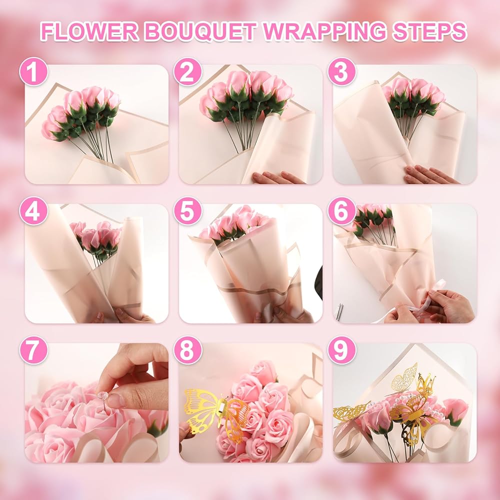 What You Will Get:You'll receive 40 sheets of floral wrapping paper(10 rose pink,10 white,10 light green and 10 black wrapping paper),4 gold crowns(coronas para ramos buchones de flores), 48 3D gold butterfly decorations(mariposas para arreglos florales), 100 flower pins, and 3 rolls of ribbons(cinta para flores eternas). These flower bouquet supplies provide plenty of options to customize your floral arrangements.
