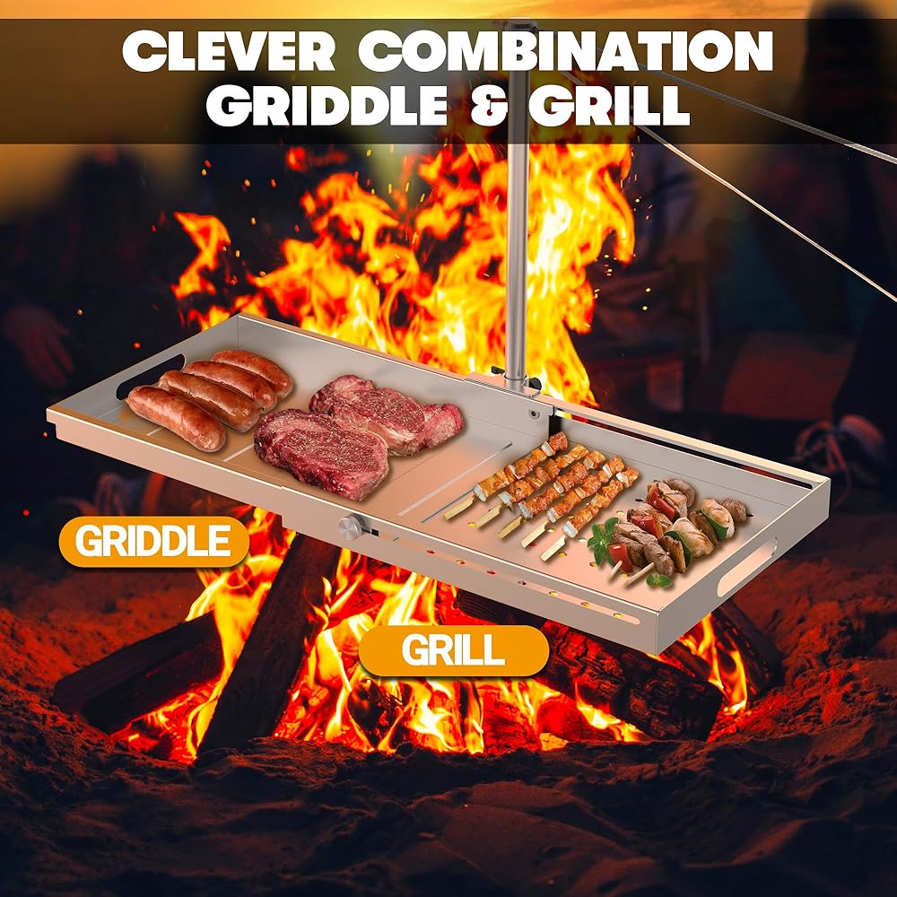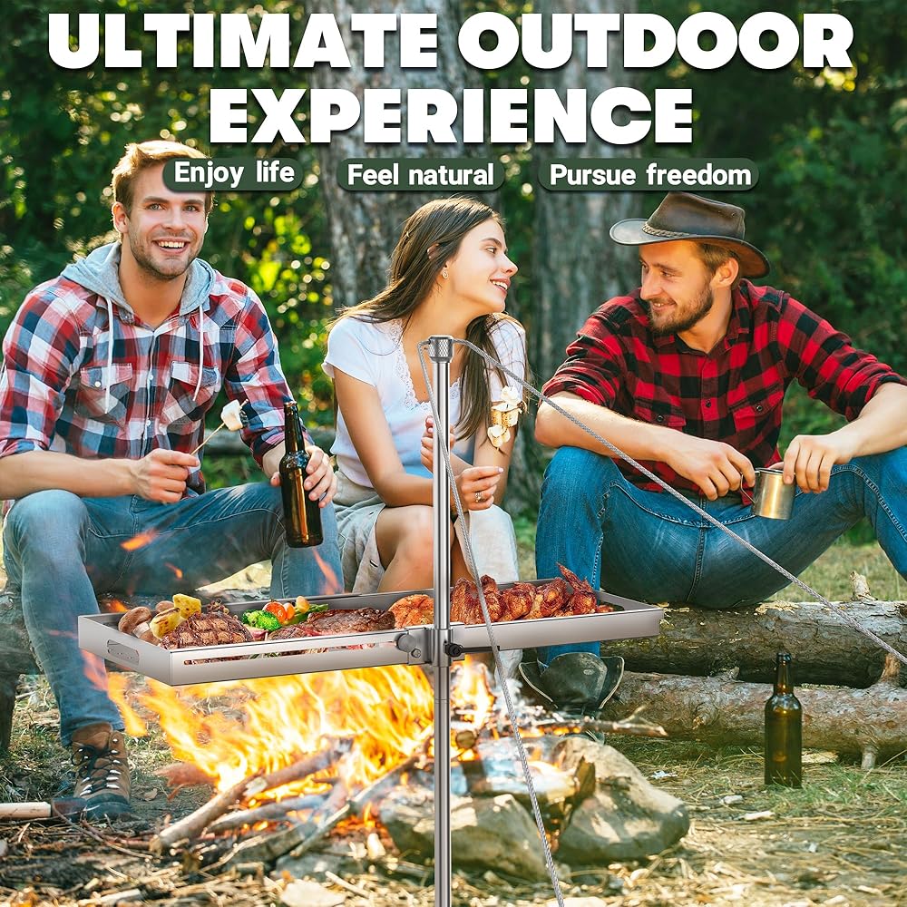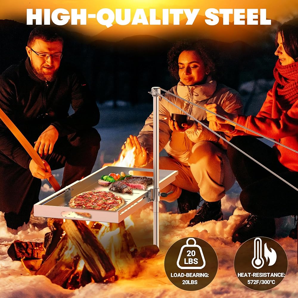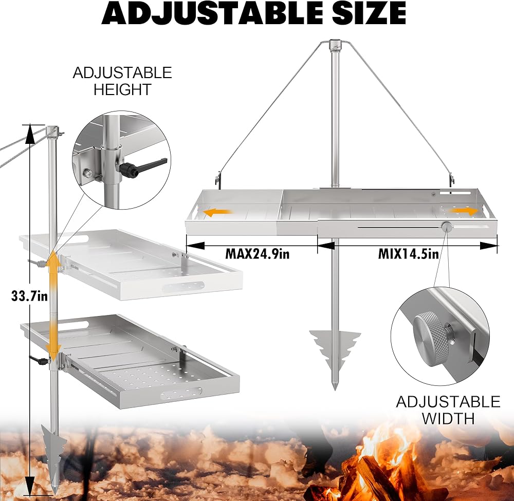 ارتفاع وحجم قابلان للتعديل: استمتع بخيارات الطبخ القابلة للتخصيص من خلال ميزات الارتفاع والحجم القابلة للتعديل في Campfire Grill. مع طول العمود 33.7 بوصة وعرض صينية الشواء 11 بوصة، يمكن تعديل الطول من 14.5 بوصة إلى 24.9 بوصة كحد أقصى لتلبية مجموعة متنوعة من احتياجات الطبخ.