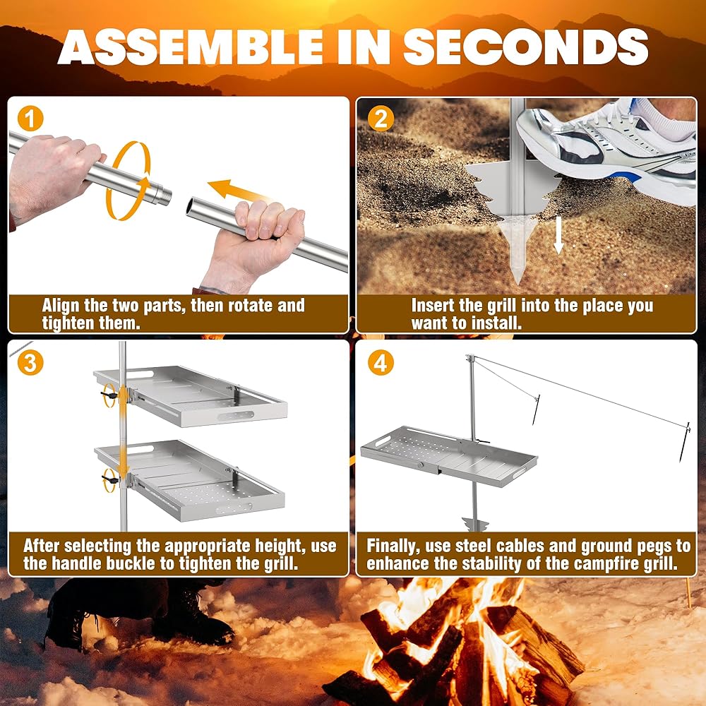 تصميم معزز للثبات: تتميز شواية نار المخيم الخاصة بنا بمزيج مبتكر من الكابلات الفولاذية والوسادة الأرضية، والتي يمكن تعديلها بسهولة لضمان الاستقرار أثناء الطهي. يمكن لشواية نار المخيم أن تدعم ما يصل إلى 20 رطلاً.