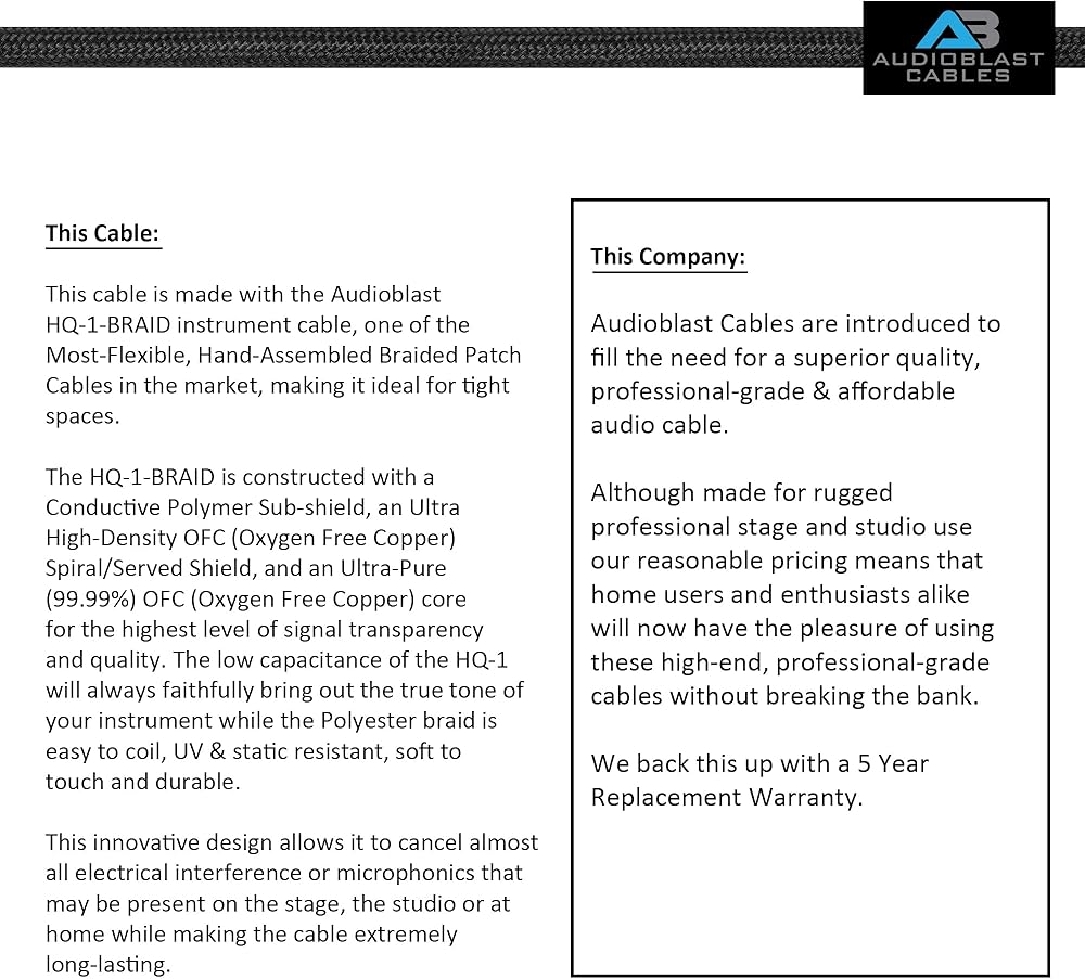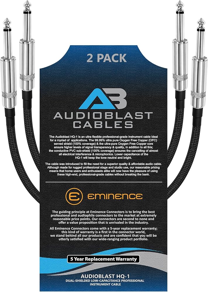 2 Units - 1.5 Foot - Audioblast HQ-1 BRAID (Black) Flexible - Dual Shielded (100%) - Guitar Bass Effects Instrument, Professional Patch Cable with Eminence E113 Straight Nickel plated 1/4 inch (6.35mm) 2-Pole TS Connectors. Staggered hand assembled Double Boot protects the cable from damage by handling stresses -The Most-Flexible, Hand-Assembled Braided Cable in the Market with Ultra-Soft, Easy to Coil, Extremely Durable Polyester Braid. Unlike Nylon Braids which proliferate the market, Polyester Braids are more Eco-Friendly (i.e.: Recyclable), Highly UV-Resistant (Colors do not fade over time), and Static Resistant. THE HQ-1 IS AN ULTRA-FLEXIBLE CABLE & CAN BE TWISTED EASILY BETWEEN YOUR PEDALS. IMPORTANT, PLEASE NOTE: The cable length is measured from the TOP OF the SLEEVE to the TOP OF SLEEVE of each connector (the measurement details are clearly depicted in one of the images in the image gallery to further clarify the measurement process. There are many images in the gallery, please click on the main image to open the full gallery).