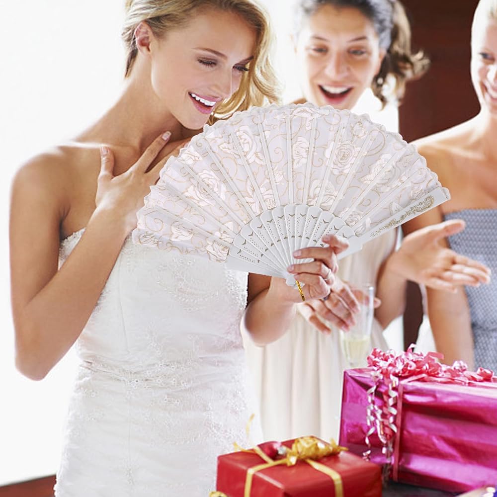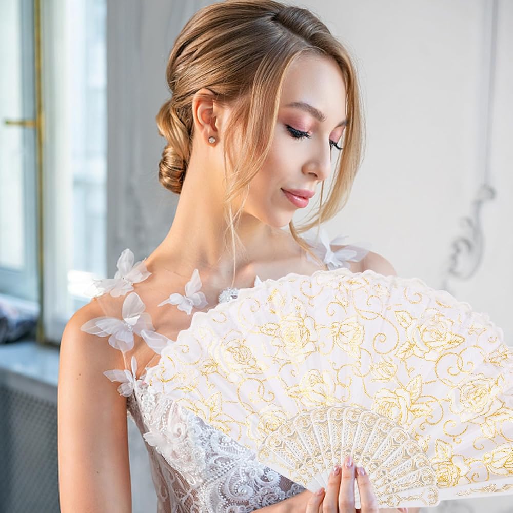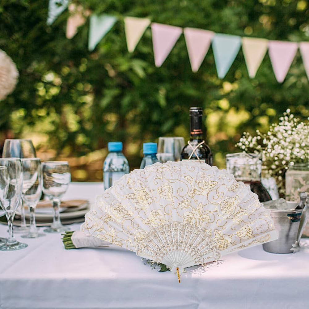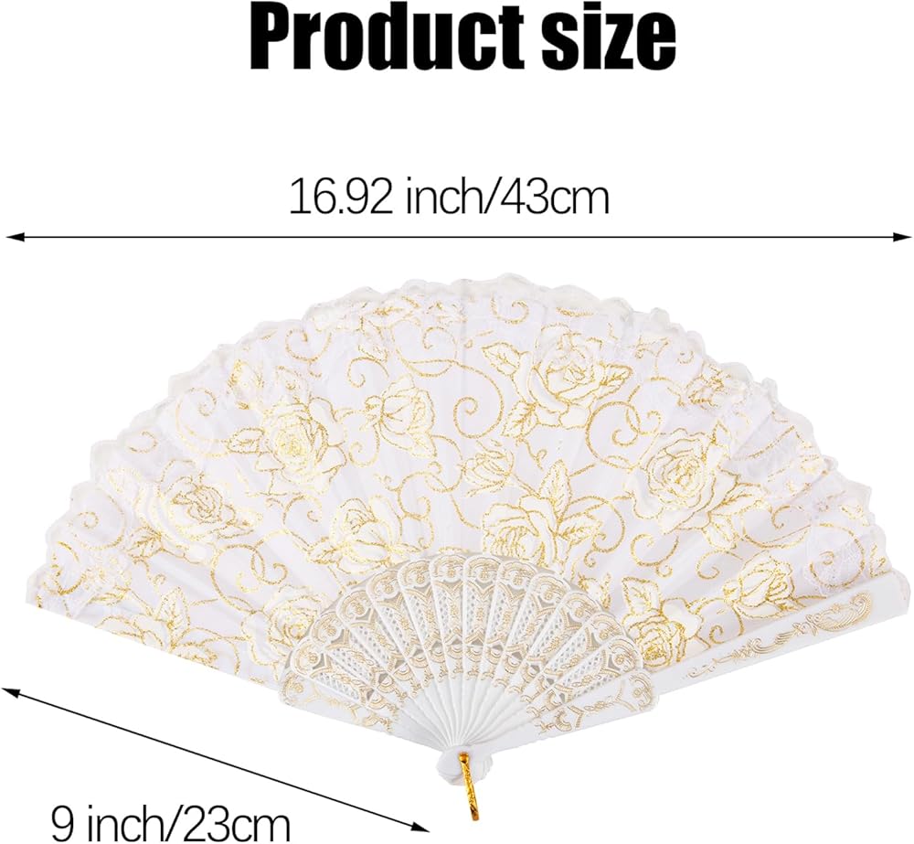 تصميمات أنيقة: تتميز هذه المروحة اليدوية القابلة للطي بإطار صغير الحجم، وبشكل أساسي على الطراز الأوروبي، وهي تعتمد نمط الدانتيل المخرم، مزين ببريق ذهبي ونمط زهور، وهو رمز للأناقة والعتيقة لحفلات الزفاف وحفلات أعياد الميلاد وحفلات الكنيسة. لوازم الحفلات