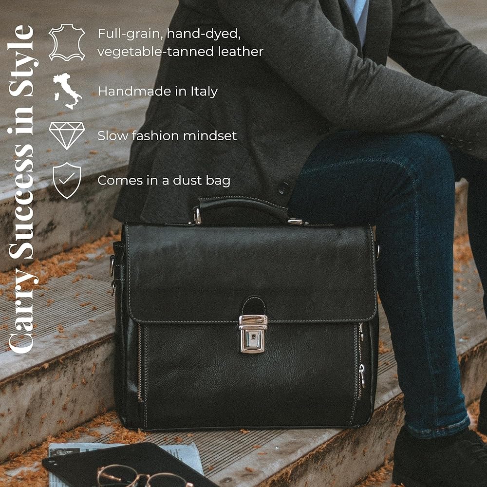 Leather Briefcase Laptop Bag - Italian Full Grain Messenger Computer Shoulder Handbag Case Portfolio Satchel Bag for Business Work Unisex - Time Resistance