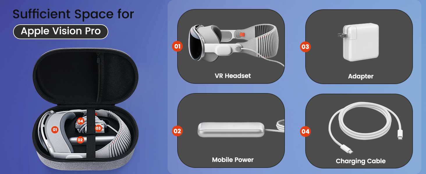 【سعة كبيرة ومقبض محمول】- تأتي حقيبة الحمل الصلبة لجهاز Vision Pro مع جيب شبكي بسحاب لكابل الشحن والإكسسوارات الصغيرة الأخرى. يتيح لك حمل Vision Pro وجميع الملحقات معك أثناء التنقل أو يومًا بعد يوم أو أثناء السفر! تتميز حقيبة الحمل Vision Pro بمقبض قوي لسهولة الحمل والاستخدام المريح أثناء السفر