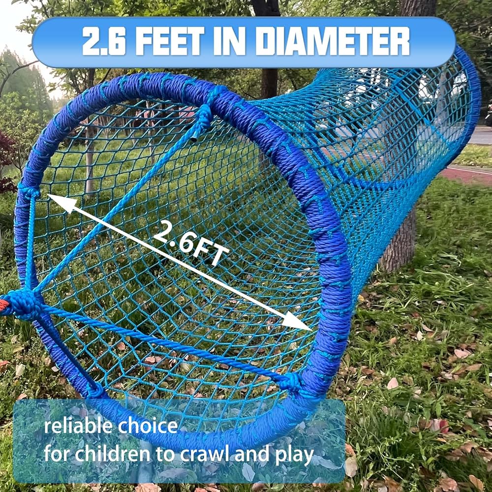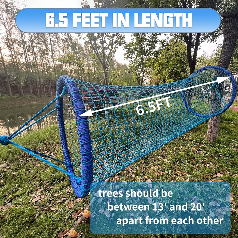 • Spacious Design: This bridge is made of durable and strong ropes that are woven together to create a tunnel-like structure. Measuring 6.5 feet in length and 2.6 feet in diameter, our rope bridge offers ample space for children to crawl and play. The trees should be between 13' and 20' apart from each other.