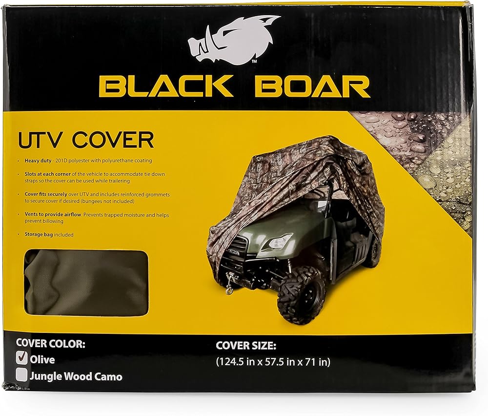 Black Boar UTV Covers help protect your UTV from rain, snow, dirt, debris and damaging UV rays while in storage. The durable 210 D polyester cover with a polyurethane coating is waterproof and UV-resistant to help prevent weather related damage. Black Boar UTV Covers provide a secure fit and feature reinforced grommets to tie the cover in place if desired (bungees not included). Vents on the sides of the UTV covers help provide airflow to prevent trapped moisture and billowing with wind. UTV cover fits most UTVs, including those with cabins, 124. 5" x 57. 5" x 71", Jungle camo cover. A storage bag is included.