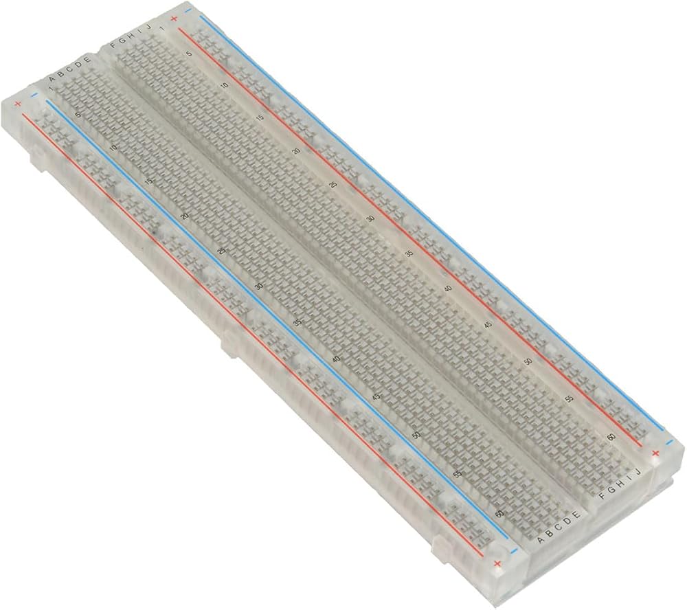 830 Point Translucent Solderless Plug-in Breadboard with 4 Power Rails The transparent base makes circuit connections visible which is helpful for students. Solderless breadboards are great for experimenting with new circuits or making prototypes because the parts can be easily changed. They are useful for both analog and digital circuits at low and moderate frequencies. --Features-- •Superior contact precision and reliability •Translucent ABS plastic base with square wire holes •Color printed legend •Breadboard can be separated to make different configurations •Adhesive tape backing for attaching to a surface or the included metal plate •Hole pitch/style: 0.1" (2.54mm), square •Contact life: 50,000 insertions •Contacts: Phosphor bronze with plated nickel finish •Rating: 36 Volts, 2 Amps •ABS heat distortion temperature: 84 Degrees C •Insertion wire: 21 to 26 AWG wire or 0.025" square post headers (0.016" to 0.028" diameter) •Dimensions: 6.5" x 2.2" x 0.3" •Lead-free and RoHS compliant