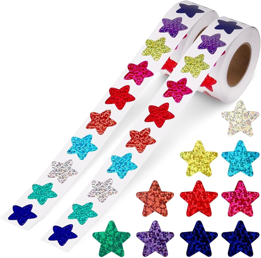 1000 PCS Incentive Stickers (1 roll 500pcs Glitter Star Stickers1 roll 500pcs Colorful heart stickers)