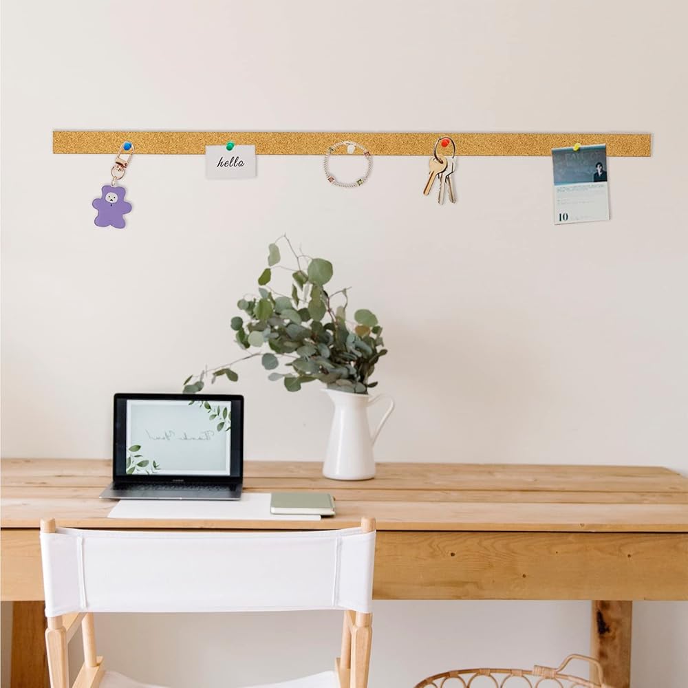 【EASY TO CUT AND HANG】 With its flexible and easy-to-cut design, our cork board bulletin bar strip can be easily customized to fit any size or shape you need, or connect two strips to make an extra-long one. It's also effortless to install, making it perfect for DIY projects and home decor.