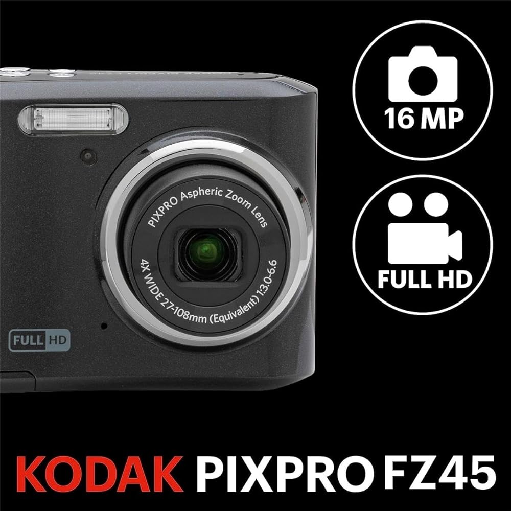 Introducing the FZ45 Friendly Zoom collection from the KODAK PIXPRO family of digital cameras. Compact, intuitive and oh so easy to use, the FZ45 is the perfect starter camera to take anywhere you go. One-touch video, red-eye removal, face detection and convenient AA batteries are just the start.