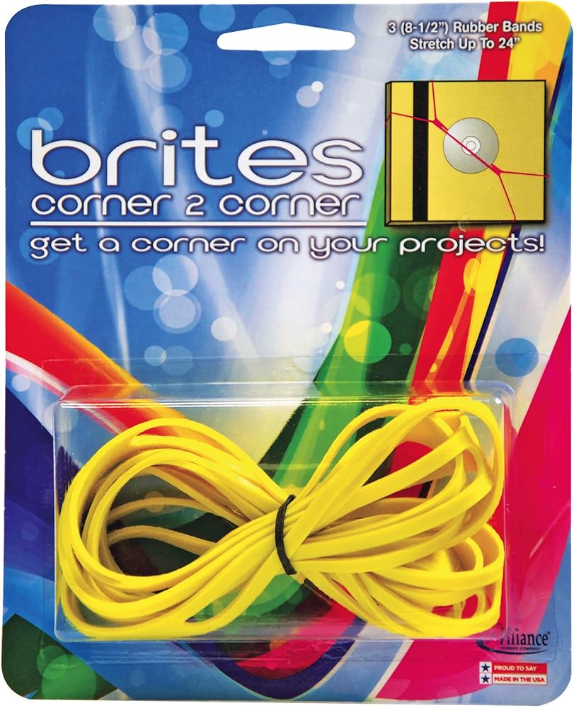 "Alliance Rubber's Brites Corner-to-Corner Bands are an innovative product with endless uses. Made from one continuous piece of rubber, these colored elastics stretch from 8 1/2 to 24. They are easy to apply, remove and reapply as needed so they are great for avoiding injury related to repetitive strain. Made from non-latex rubber, they are an ideal choice for latex-free homes and businesses. Corner-to-Corner Bands feature wide, flexible loops for easy application, and come in a bright yellow color making them ideal for visible home and office organization. These colored elastics are great for bundling and securing files, paperwork, photo albums and scrapbooks. They are freezer and microwave safe, making them great for creating a tight seal on food storage for the fridge, freezer, or while transporting. When packing to prepare for a move or transporting boxes in the car, Corner-to-Corner bands provide a tight and reliable alternative to tape, twine or string."